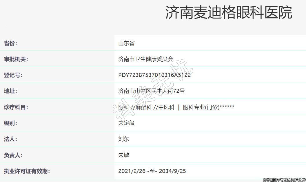 濟南麥迪格眼科2019-07-09成立,地址:濟南市市中區(qū)民生大街72號,診療科目:眼科 //麻醉科 //中醫(yī)科 | 眼科專業(yè)(門診)******