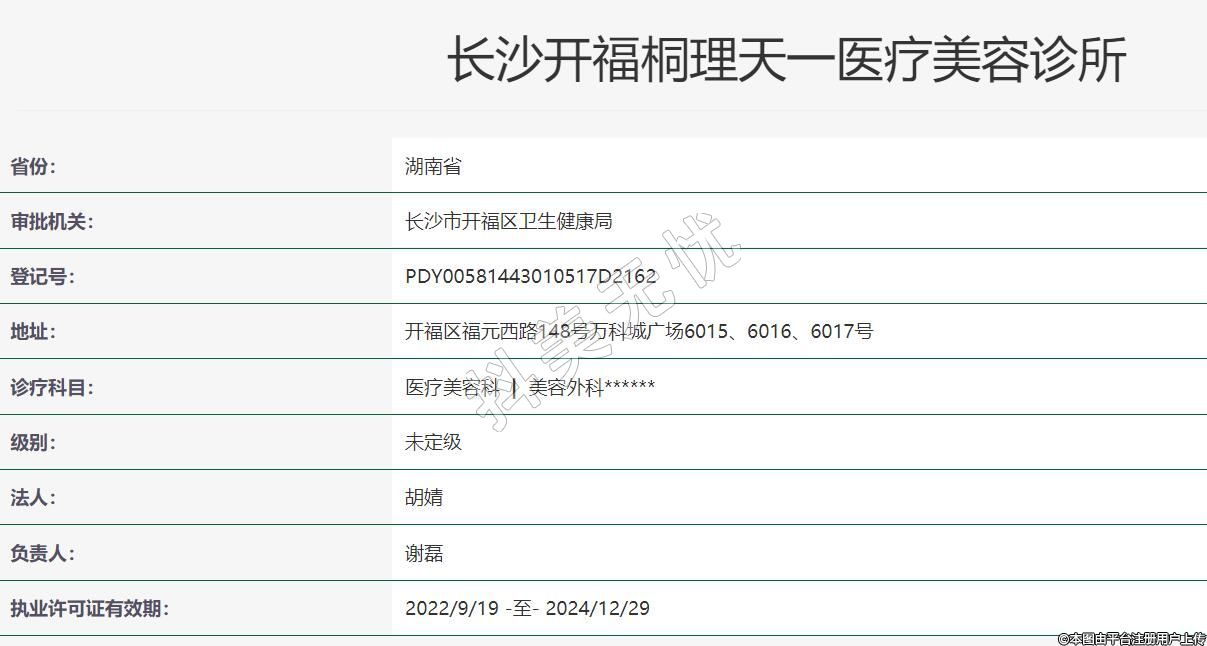 長沙桐理天一醫(yī)療美容2022年07月13日成立,地址:開福區(qū)福元西路148號萬科城廣場6015、6016、6017號,診療科目:醫(yī)療美容科 | 美容外科******