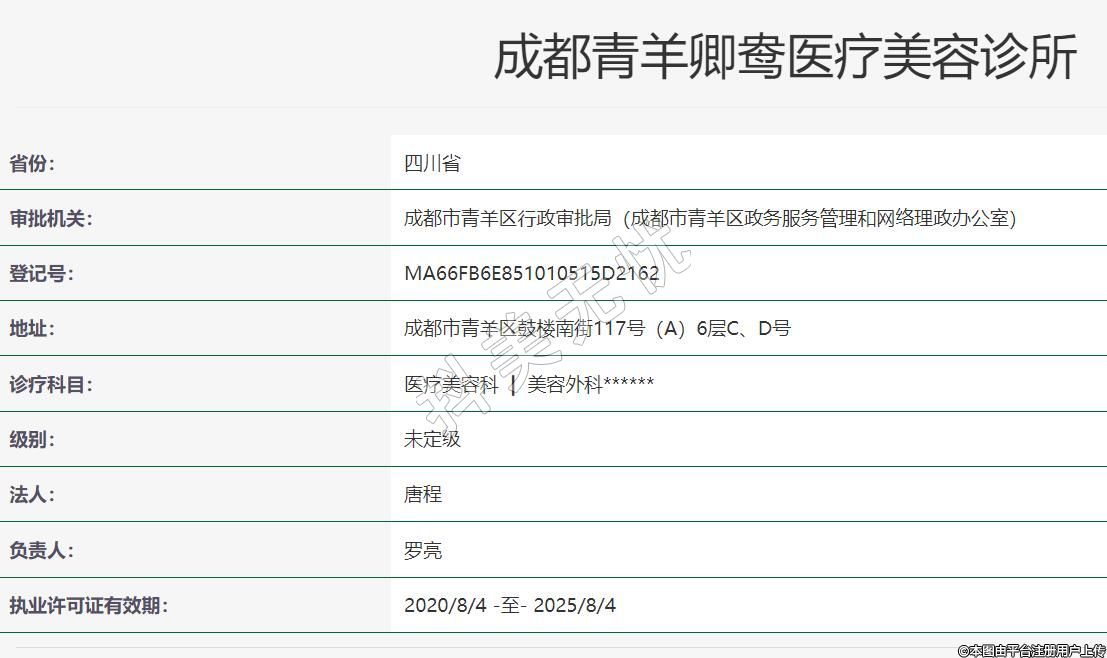 成都卿鴦醫(yī)療美容2020年03月27日成立,地址:成都市青羊區(qū)鼓樓南街117號(A)6層C、D號,診療科目:醫(yī)療美容科 | 美容外科******