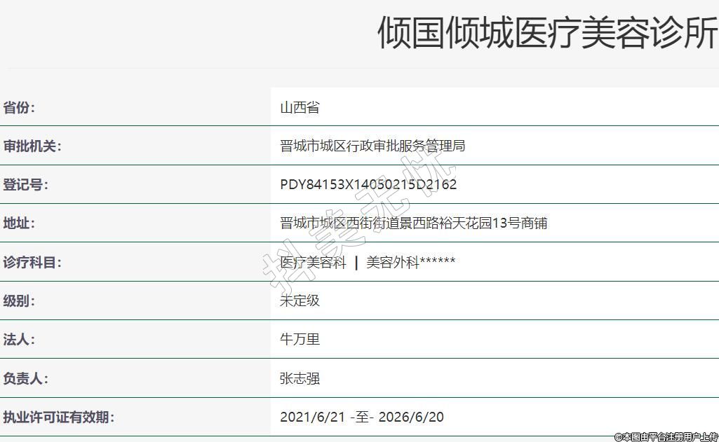 晉城傾國傾城醫(yī)療美容2021-05-11成立,地址:晉城市城區(qū)西街街道景西路裕天花園13號商鋪,診療科目:醫(yī)療美容科 | 美容外科******