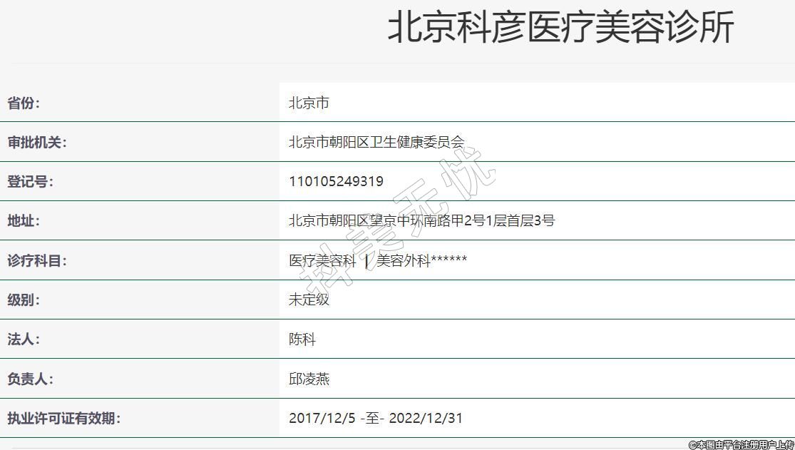 北京科彥醫(yī)療美容2017-07-12成立,地址:北京市朝陽區(qū)望京中環(huán)南路甲2號1層首層3號,診療科目:醫(yī)療美容科 | 美容外科******