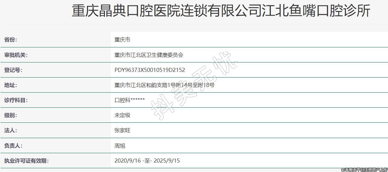 重慶晶典口腔(魚嘴店)2020-05-27成立,地址:重慶市江北區(qū)和韻支路1號附14號至附18號,診療科目:口腔科******