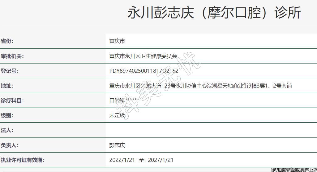 永川彭志慶摩爾口腔2017-06-16成立,地址:重慶市永川區(qū)興龍大道123號永川協(xié)信中心濱湖星天地商業(yè)街9幢3層1、2號商鋪,診療科目:口腔科******