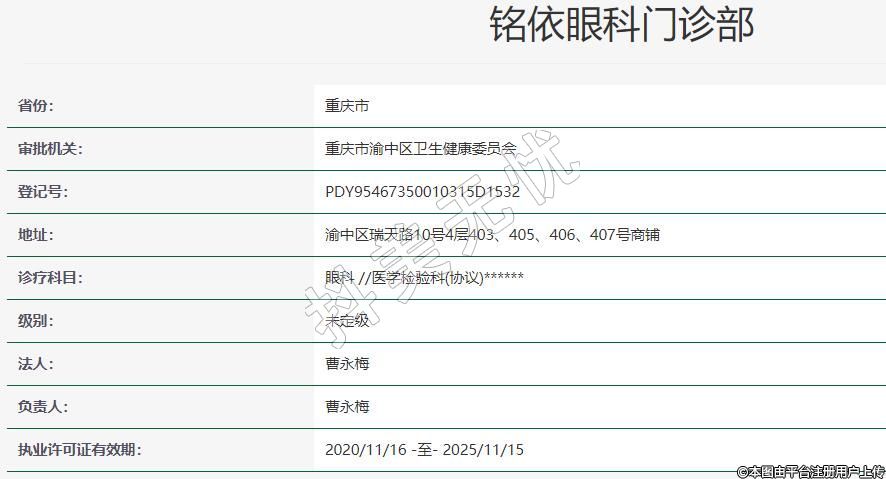 重慶銘依眼科門診部創(chuàng)立于2020年,坐落于重慶市渝中區(qū)瑞天路10號4層403、405、406、407號店鋪。是經(jīng)重慶市衛(wèi)健委批準設(shè)立的眼??漆t(yī)療機構(gòu),以眼視光方向為主要經(jīng)營目標,實行預(yù)約制管理。??铺厣珵閭€性化治療中高度近視的ICL晶體植入近視矯正技術(shù),近視防控技術(shù),及精準的干眼癥診療眼健康管理服務(wù)為主要診療科目。
