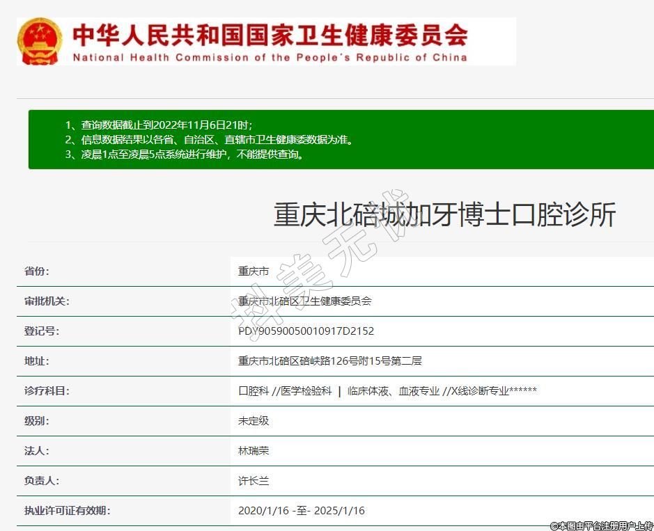 重慶北碚城加牙博士口腔2019-09-03成立,地址:重慶市北碚區(qū)碚峽路126號附15號第二層,診療科目:口腔科 //醫(yī)學(xué)檢驗科 | 臨床體液、血液專業(yè) //X線診斷專業(yè)******