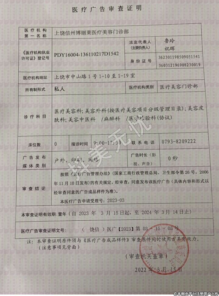 醫(yī)療機構名:上饒信州博麗萊醫(yī)療美容門診部