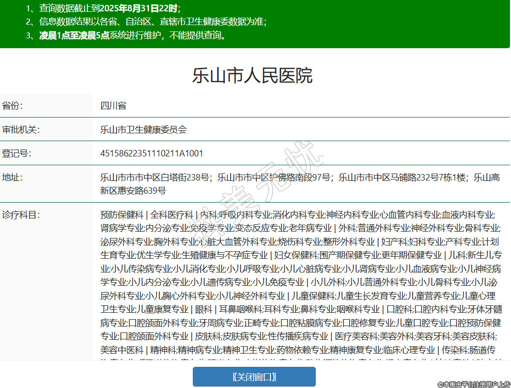 省份:四川省審批機(jī)關(guān):樂山市衛(wèi)生健康委員會(huì)登記號(hào):45158622351110211A1001地址:樂山市市市中區(qū)白塔街238號(hào);樂山市市中區(qū)護(hù)佛路南段97號(hào);樂山市市中區(qū)馬鋪路232號(hào)7棟1樓;樂山高新區(qū)惠安路639號(hào)診療科目:預(yù)防保健科 | 全科醫(yī)療科 | 內(nèi)科;呼吸內(nèi)科專業(yè);消化內(nèi)科專業(yè);神經(jīng)內(nèi)科專業(yè);心血管內(nèi)科專業(yè);血液內(nèi)科專業(yè);腎病學(xué)專業(yè);內(nèi)分泌專業(yè);免疫學(xué)專業(yè);變態(tài)反應(yīng)專業(yè);老年病專業(yè) | 外科;普通外科專業(yè);神經(jīng)外科專業(yè);骨科專業(yè);泌尿外科專業(yè);胸外科專業(yè);心臟大血管外科專業(yè);燒傷科專業(yè);整形外科專業(yè) | 婦產(chǎn)科;婦科專業(yè);產(chǎn)科專業(yè);計(jì)劃生育專業(yè);優(yōu)生學(xué)專業(yè);生殖健康與不孕癥專業(yè) | 婦女保健科;圍產(chǎn)期保健專業(yè);更年期保健專業(yè) | 兒科;新生兒專業(yè);小兒傳染病專業(yè);小兒消化專業(yè);小兒呼吸專業(yè);小兒心臟病專業(yè);小兒腎病專業(yè);小兒血液病專業(yè);小兒神經(jīng)病學(xué)專業(yè);小兒內(nèi)分泌專業(yè);小兒遺傳病專業(yè);小兒免疫專業(yè) | 小兒外科;小兒普通外科專業(yè);小兒骨科專業(yè);小兒泌尿外科專業(yè);小兒胸心外科專業(yè);小兒神經(jīng)外科專業(yè) | 兒童保健科;兒童生長(zhǎng)發(fā)育專業(yè);兒童營(yíng)養(yǎng)專業(yè);兒童心理衛(wèi)生專業(yè);兒童康復(fù)專業(yè) | 眼科 | 耳鼻咽喉科;耳科專業(yè);鼻科專業(yè);咽喉科專業(yè) | 口腔科;口腔內(nèi)科專業(yè);牙體牙髓病專業(yè);口腔頜面外科專業(yè);牙周病專業(yè);正畸專業(yè);口腔粘膜病專業(yè);口腔修復(fù)專業(yè);兒童口腔專業(yè);口腔預(yù)防保健專業(yè);口腔頜面外科專業(yè) | 皮膚科;皮膚病專業(yè);性傳播疾病專業(yè) | 醫(yī)療美容科;美容外科;美容牙科;美容皮膚科;美容中醫(yī)科 | 精神科;精神病專業(yè);精神衛(wèi)生專業(yè);藥物依賴專業(yè);精神康復(fù)專業(yè);臨床心理專業(yè) | 傳染科;腸道傳染病專業(yè);呼吸道傳染病專業(yè);肝炎專業(yè);蟲媒傳染病專業(yè);動(dòng)物源性傳染病專業(yè);蠕蟲病專業(yè) | 結(jié)核病科 | 腫瘤科 | 急診醫(yī)學(xué)科 | 康復(fù)醫(yī)學(xué)科 | 麻醉科 | 疼痛科 | 重癥醫(yī)學(xué)科 | 醫(yī)學(xué)檢驗(yàn)科;臨床體液、血液專業(yè);臨床微生物學(xué)專業(yè);臨床化學(xué)檢驗(yàn)專業(yè);臨床免疫、血清學(xué)專業(yè);臨床細(xì)胞分子遺傳學(xué)專業(yè) | 病理科 | 醫(yī)學(xué)影像科;X線診斷專業(yè);CT診斷專業(yè);磁共振成像診斷專業(yè);核醫(yī)學(xué)專業(yè);超聲診斷專業(yè);心電診斷專業(yè);腦電及腦血流圖診斷專業(yè);神經(jīng)肌肉電圖專業(yè);介入放射學(xué)專業(yè);放射治療專業(yè) | 中醫(yī)科;內(nèi)科專業(yè);外科專業(yè);婦產(chǎn)科專業(yè);兒科專業(yè);皮膚科專業(yè);眼科專業(yè);耳鼻咽喉科專業(yè);骨傷科專業(yè);肛腸科專業(yè);老年病科專業(yè);針灸科專業(yè);推拿科專業(yè);康復(fù)醫(yī)學(xué)專業(yè);預(yù)防保健科專業(yè) | 中西醫(yī)結(jié)合科******級(jí)別:三級(jí)法定代表人:曾國(guó)軍主要負(fù)責(zé)人:曾國(guó)軍執(zhí)業(yè)許可證有效期:2025/06/25 -至- 2040/02/27 -