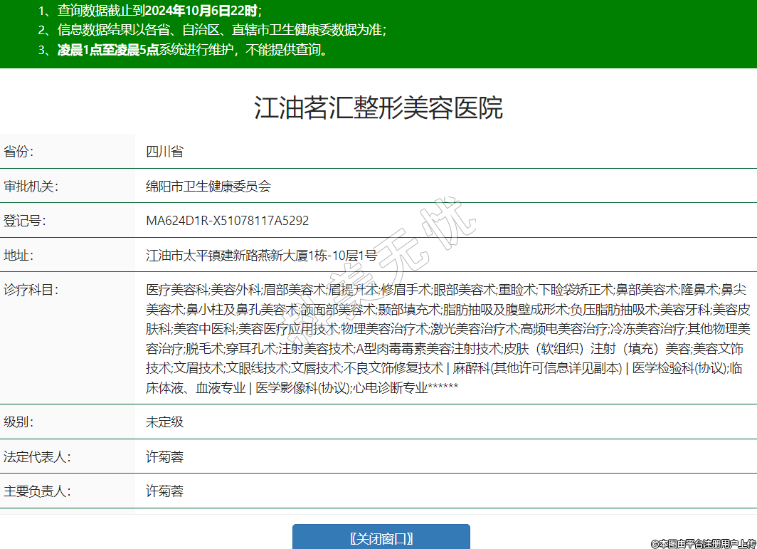 醫(yī)療美容科;美容外科;眉部美容術(shù);眉提升術(shù);修眉手術(shù);眼部美容術(shù);重瞼術(shù);下瞼袋矯正術(shù);鼻部美容術(shù);隆鼻術(shù);鼻尖美容術(shù);鼻小柱及鼻孔美容術(shù);頜面部美容術(shù);顳部填充術(shù);脂肪抽吸及腹壁成形術(shù);負(fù)壓脂肪抽吸術(shù);美容牙科;美容皮膚科;美容中醫(yī)科;美容醫(yī)療應(yīng)用技術(shù);物理美容治療術(shù);激光美容治療術(shù);高頻電美容治療;冷凍美容治療;其他物理美容治療;脫毛術(shù);穿耳孔術(shù);注射美容技術(shù);A型肉毒毒素美容注射技術(shù);皮膚(軟組織)注射(填充)美容;美容文飾技術(shù);文眉技術(shù);文眼線技術(shù);文唇技術(shù);不良文飾修復(fù)技術(shù) | 麻醉科(其他許可信息詳見副本) | 醫(yī)學(xué)檢驗(yàn)科(協(xié)議);臨床體液、血液專業(yè) | 醫(yī)學(xué)影像科(協(xié)議);心電診斷專業(yè)******