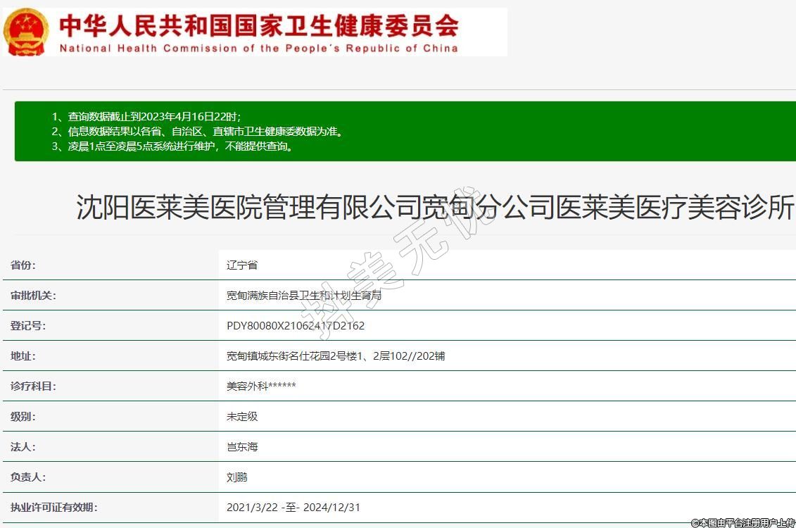 沈陽醫(yī)萊美醫(yī)院管理有限公司寬甸分公司醫(yī)萊美醫(yī)療美容診所