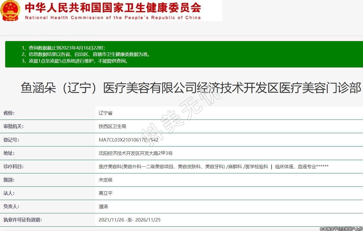 魚涵朵(遼寧)醫(yī)療美容有限公司經(jīng)濟技術(shù)開發(fā)區(qū)醫(yī)療美容門診部