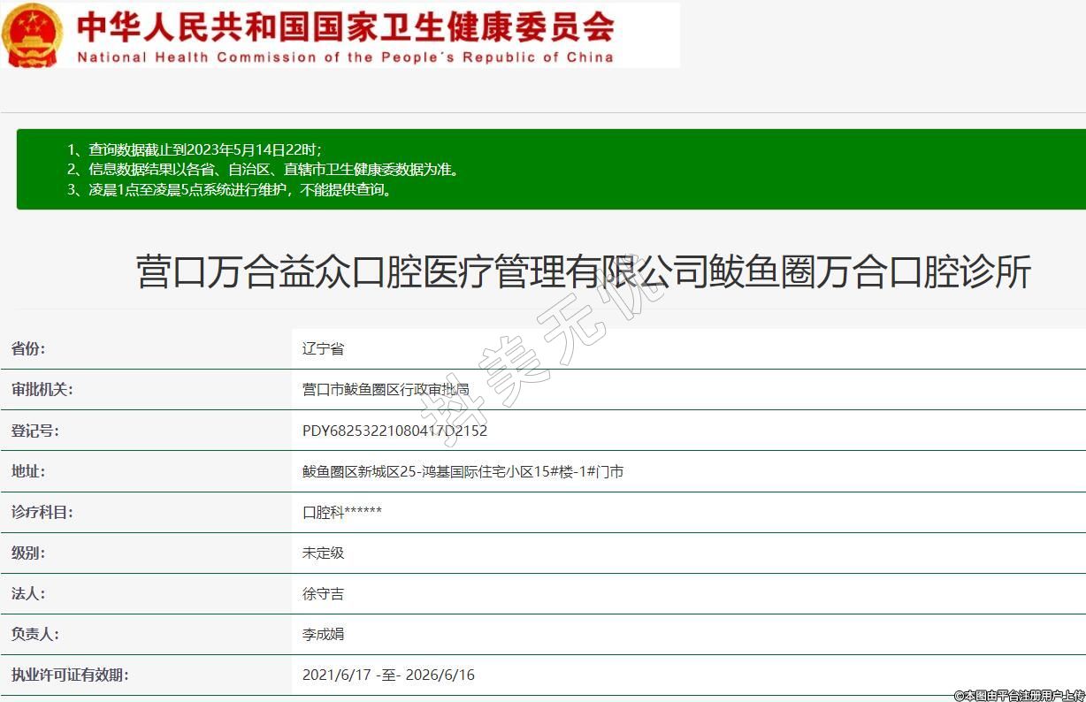 營口萬合益眾口腔醫(yī)療管理有限公司鲅魚圈萬合口腔診所,診療科目:口腔科******