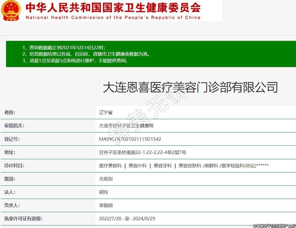 大連恩喜醫(yī)療美容門診部有限公司,診療科目:醫(yī)療美容科 | 美容外科 | 美容牙科 | 美容皮膚科 /麻醉科 /醫(yī)學(xué)檢驗科(協(xié)議)******