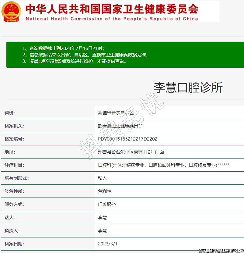 鄯善李慧口腔,診療科目:口腔科(牙體牙髓病專業(yè),口腔頜面外科專業(yè),口腔修復專業(yè))******