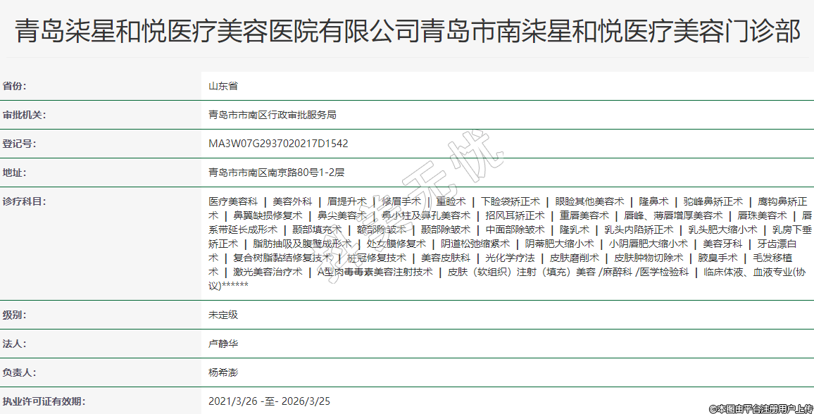 青島柒星和悅醫(yī)療美容醫(yī)院有限公司青島市南柒星和悅醫(yī)療美容門(mén)診部