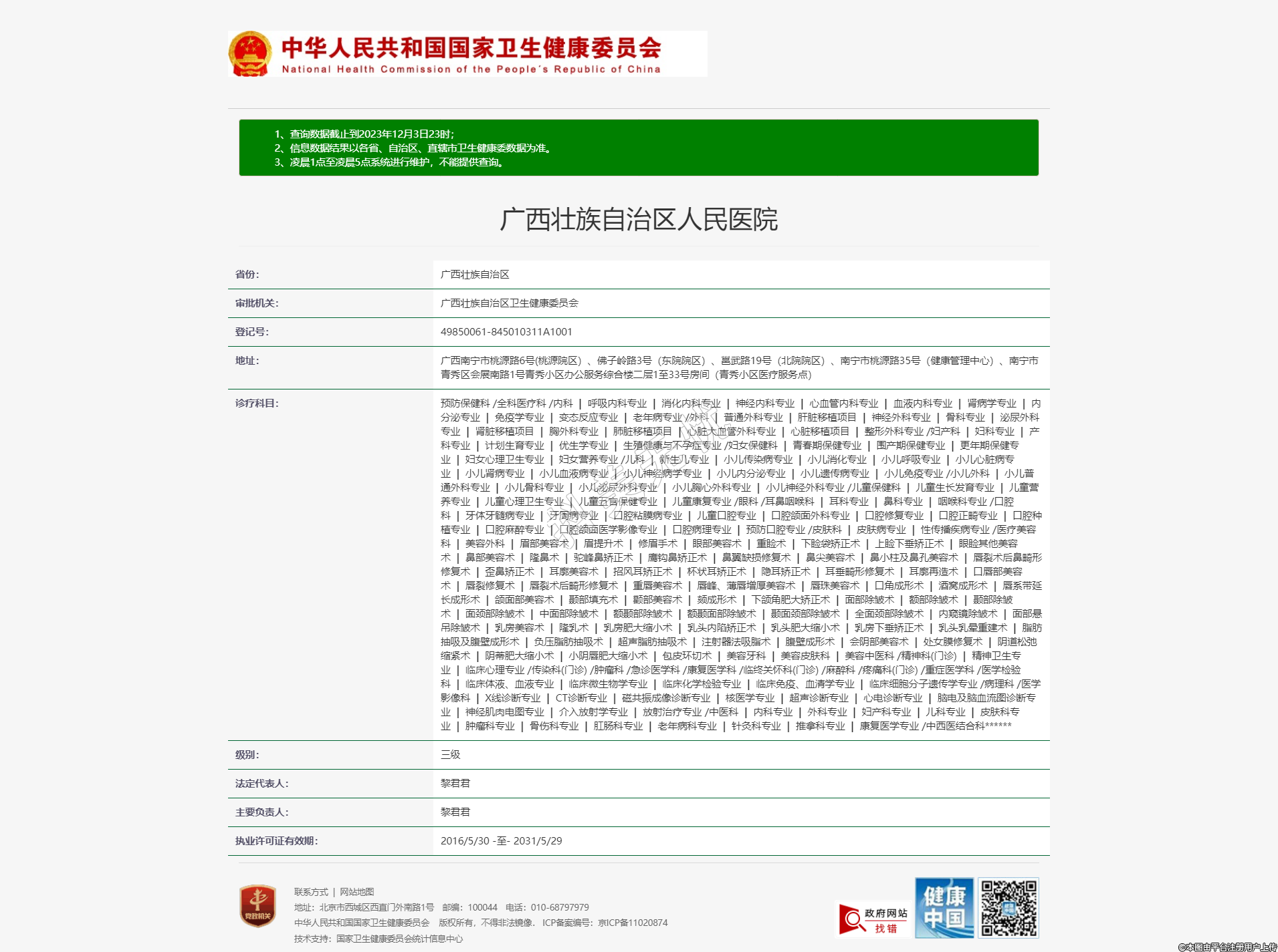 地址:廣西南寧市桃源路6號(hào)(桃源院區(qū))、佛子嶺路3號(hào)(東院院區(qū))、邕武路19號(hào)(北院院區(qū))、南寧市桃源路35號(hào)(健康管理中心)、南寧市青秀區(qū)會(huì)展南路1號(hào)青秀小區(qū)辦公服務(wù)綜合樓二層1至33號(hào)房間(青秀小區(qū)醫(yī)療服務(wù)點(diǎn))