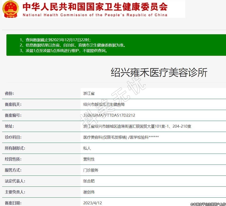 紹興雍禾醫(yī)療美容診所,診療科目:醫(yī)療美容科(僅限毛發(fā)移植) /醫(yī)學(xué)檢驗(yàn)科******