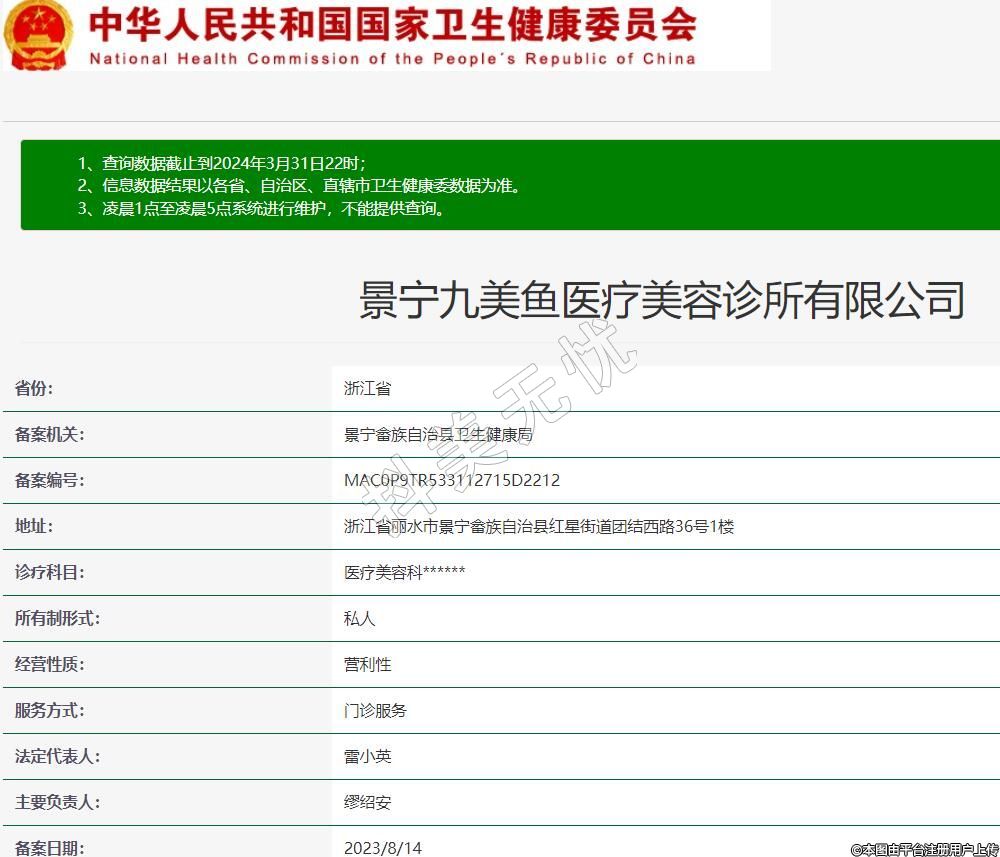 景寧九美魚醫(yī)療美容診所有限公司,診療科目:醫(yī)療美容科******