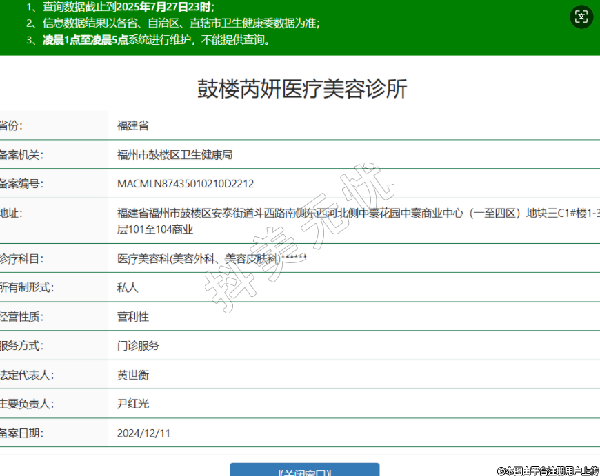 省份:福建省備案機關(guān):福州市鼓樓區(qū)衛(wèi)生健康局備案編號:MACMLN87435010210D2212地址:福建省福州市鼓樓區(qū)安泰街道斗西路南側(cè)東西河北側(cè)中寰花園中寰商業(yè)中心(一至四區(qū))地塊三C1#樓1-3層101至104商業(yè)診療科目:醫(yī)療美容科(美容外科、美容皮膚科)******所有制形式:私人經(jīng)營性質(zhì):營利性服務方式:門診服務法定代表人:黃世衡主要負責人:尹紅光備案日期:2024/12/11 -