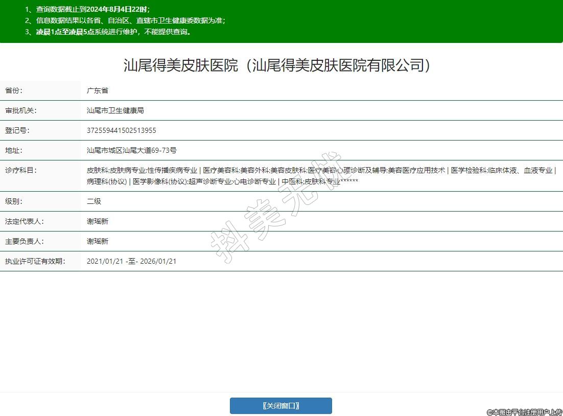 汕尾得美皮膚醫(yī)院(汕尾得美皮膚醫(yī)院有限公司)診療科目:皮膚科;皮膚病專業(yè);性傳播疾病專業(yè) | 醫(yī)療美容科;美容外科;美容皮膚科;醫(yī)療美容心理診斷及輔導(dǎo);美容醫(yī)療應(yīng)用技術(shù) | 醫(yī)學(xué)檢驗(yàn)科;臨床體液、血液專業(yè) | 病理科(協(xié)議) | 醫(yī)學(xué)影像科(協(xié)議);超聲診斷專業(yè);心電診斷專業(yè) | 中醫(yī)科;皮膚科專業(yè)******