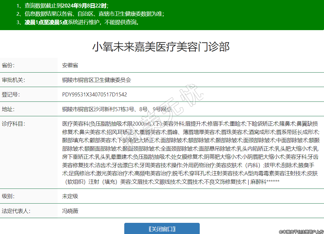 醫(yī)療美容科(負(fù)壓脂肪抽吸術(shù)限2000ml以下);美容外科;眉提升術(shù);修眉手術(shù);重瞼術(shù);下瞼袋矯正術(shù);隆鼻術(shù);鼻翼缺損修復(fù)術(shù);鼻尖美容術(shù);招風(fēng)耳矯正術(shù);重唇美容術(shù);唇峰、薄唇增厚美容術(shù);唇珠美容術(shù);酒窩成形術(shù);唇系帶延長成形術(shù);顳部填充術(shù);顴部美容術(shù);下頜角肥大矯正術(shù);面部除皺術(shù);額部除皺術(shù);顳部除皺術(shù);面頸部除皺術(shù);中面部除皺術(shù);額顳部除皺術(shù);額顳面部除皺術(shù);顳面頸部除皺術(shù);全面頸部除皺術(shù);面部懸吊除皺術(shù);乳頭內(nèi)陷矯正術(shù);乳頭肥大縮小術(shù);乳房下垂矯正術(shù);乳頭乳暈重建術(shù);負(fù)壓脂肪抽吸術(shù);處女膜修復(fù)術(shù);陰蒂肥大縮小術(shù);小陰唇肥大縮小術(shù);美容牙科;牙齒美容修復(fù)技術(shù);潔齒術(shù);牙齒漂白術(shù);牙周美容技術(shù)操作;外用藥物治療;美容皮膚術(shù)(內(nèi)科);拔甲術(shù);刮除術(shù);腋臭手術(shù);足病修治術(shù);激光美容治療術(shù);高頻電美容治療;脫毛術(shù);穿耳孔術(shù);注射美容技術(shù);A型肉毒毒素美容注射技術(shù);皮膚(軟組織)注射(填充)美容;文眉技術(shù);文眼線技術(shù);文唇技術(shù);不良文飾修復(fù)技術(shù) | 麻醉科******