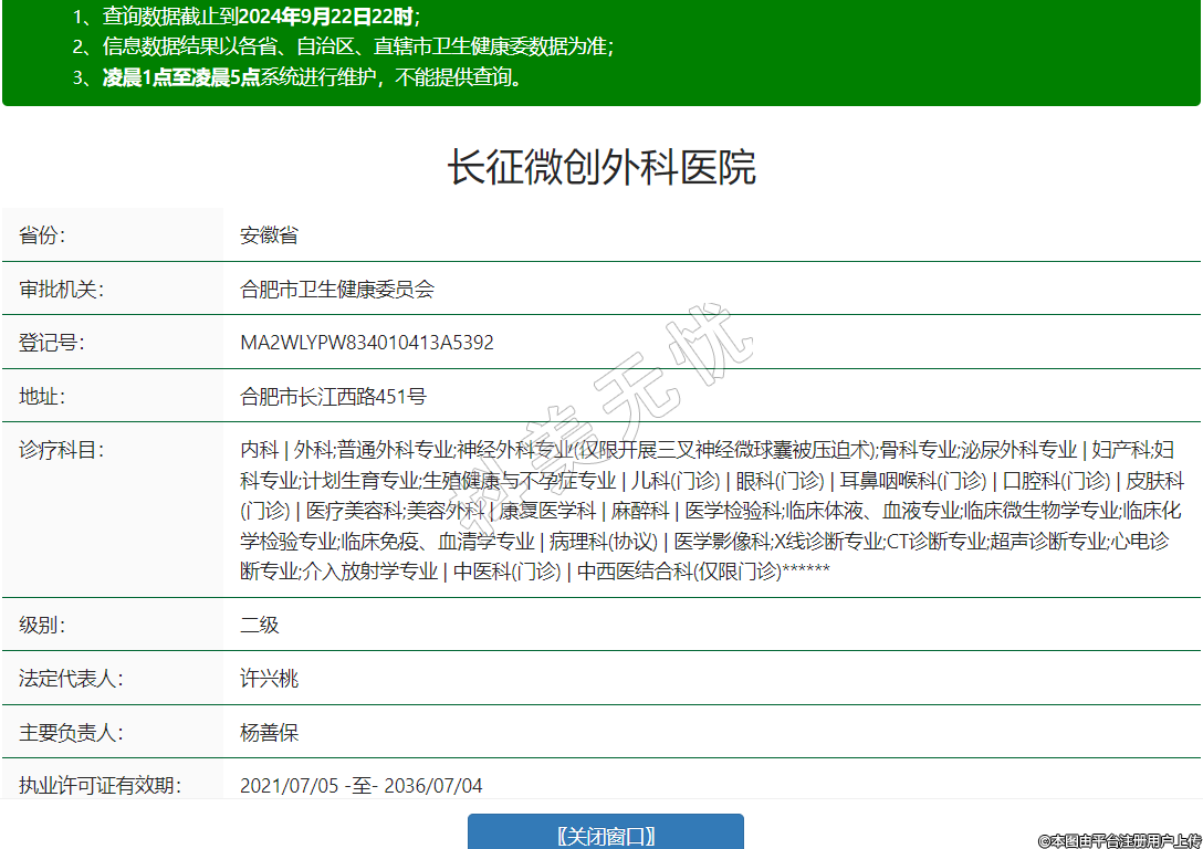內(nèi)科 | 外科;普通外科專業(yè);神經(jīng)外科專業(yè)(僅限開展三叉神經(jīng)微球囊被壓迫術(shù));骨科專業(yè);泌尿外科專業(yè) | 婦產(chǎn)科;婦科專業(yè);計劃生育專業(yè);生殖健康與不孕癥專業(yè) | 兒科(門診) | 眼科(門診) | 耳鼻咽喉科(門診) | 口腔科(門診) | 皮膚科(門診) | 醫(yī)療美容科;美容外科 | 康復(fù)醫(yī)學(xué)科 | 麻醉科 | 醫(yī)學(xué)檢驗科;臨床體液、血液專業(yè);臨床微生物學(xué)專業(yè);臨床化學(xué)檢驗專業(yè);臨床免疫、血清學(xué)專業(yè) | 病理科(協(xié)議) | 醫(yī)學(xué)影像科;X線診斷專業(yè);CT診斷專業(yè);超聲診斷專業(yè);心電診斷專業(yè);介入放射學(xué)專業(yè) | 中醫(yī)科(門診) | 中西醫(yī)結(jié)合科(僅限門診)******