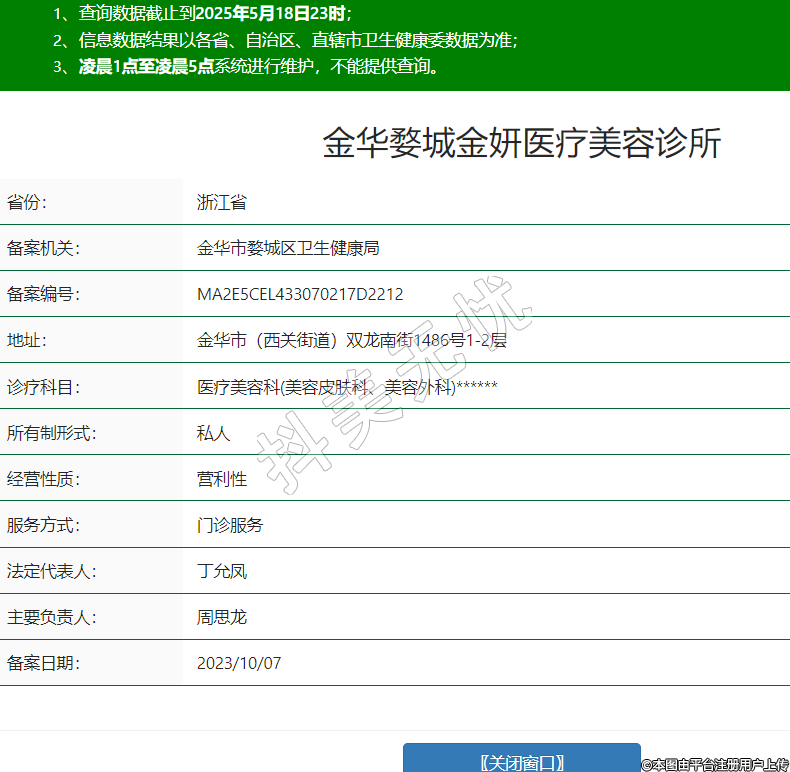 省份:浙江省備案機(jī)關(guān):金華市婺城區(qū)衛(wèi)生健康局備案編號(hào):MA2E5CEL433070217D2212地址:金華市(西關(guān)街道)雙龍南街1486號(hào)1-2層診療科目:醫(yī)療美容科(美容皮膚科、美容外科)******所有制形式:私人經(jīng)營(yíng)性質(zhì):營(yíng)利性服務(wù)方式:門診服務(wù)法定代表人:丁允鳳主要負(fù)責(zé)人:周思龍備案日期:2023/10/07 -