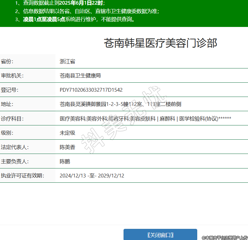 省份:浙江省審批機(jī)關(guān):蒼南縣衛(wèi)生健康局登記號(hào):PDY71020633032717D1542地址:蒼南縣靈溪鎮(zhèn)御景園1-2-3-5幢112室、113室二樓前側(cè)診療科目:醫(yī)療美容科;美容外科;美容牙科;美容皮膚科 | 麻醉科 | 醫(yī)學(xué)檢驗(yàn)科(協(xié)議)******級(jí)別:未定級(jí)法定代表人:陳美香主要負(fù)責(zé)人:陳鵬執(zhí)業(yè)許可證有效期:2024/12/13 -至- 2029/12/12 -