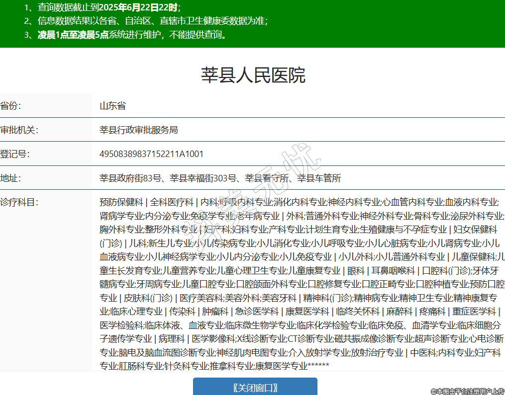 省份:山東省審批機關:莘縣行政審批服務局登記號:49508389837152211A1001地址:莘縣政府街83號、莘縣幸福街303號、莘縣看守所、莘縣車管所診療科目:預防保健科 | 全科醫(yī)療科 | 內(nèi)科;呼吸內(nèi)科專業(yè);消化內(nèi)科專業(yè);神經(jīng)內(nèi)科專業(yè);心血管內(nèi)科專業(yè);血液內(nèi)科專業(yè);腎病學專業(yè);內(nèi)分泌專業(yè);免疫學專業(yè);老年病專業(yè) | 外科;普通外科專業(yè);神經(jīng)外科專業(yè);骨科專業(yè);泌尿外科專業(yè);胸外科專業(yè);整形外科專業(yè) | 婦產(chǎn)科;婦科專業(yè);產(chǎn)科專業(yè);計劃生育專業(yè);生殖健康與不孕癥專業(yè) | 婦女保健科(門診) | 兒科;新生兒專業(yè);小兒傳染病專業(yè);小兒消化專業(yè);小兒呼吸專業(yè);小兒心臟病專業(yè);小兒腎病專業(yè);小兒血液病專業(yè);小兒神經(jīng)病學專業(yè);小兒內(nèi)分泌專業(yè);小兒免疫專業(yè) | 小兒外科;小兒普通外科專業(yè) | 兒童保健科;兒童生長發(fā)育專業(yè);兒童營養(yǎng)專業(yè);兒童心理衛(wèi)生專業(yè);兒童康復專業(yè) | 眼科 | 耳鼻咽喉科 | 口腔科(門診);牙體牙髓病專業(yè);牙周病專業(yè);兒童口腔專業(yè);口腔頜面外科專業(yè);口腔修復專業(yè);口腔正畸專業(yè);口腔種植專業(yè);預防口腔專業(yè) | 皮膚科(門診) | 醫(yī)療美容科;美容外科;美容牙科 | 精神科(門診);精神病專業(yè);精神衛(wèi)生專業(yè);精神康復專業(yè);臨床心理專業(yè) | 傳染科 | 腫瘤科 | 急診醫(yī)學科 | 康復醫(yī)學科 | 臨終關懷科 | 麻醉科 | 疼痛科 | 重癥醫(yī)學科 | 醫(yī)學檢驗科;臨床體液、血液專業(yè);臨床微生物學專業(yè);臨床化學檢驗專業(yè);臨床免疫、血清學專業(yè);臨床細胞分子遺傳學專業(yè) | 病理科 | 醫(yī)學影像科;X線診斷專業(yè);CT診斷專業(yè);磁共振成像診斷專業(yè);超聲診斷專業(yè);心電診斷專業(yè);腦電及腦血流圖診斷專業(yè);神經(jīng)肌肉電圖專業(yè);介入放射學專業(yè);放射治療專業(yè) | 中醫(yī)科;內(nèi)科專業(yè);婦產(chǎn)科專業(yè);肛腸科專業(yè);針灸科專業(yè);推拿科專業(yè);康復醫(yī)學專業(yè)******級別:二級法定代表人:李文元主要負責人:李文元執(zhí)業(yè)許可證有效期:2025/03/19 -至- 2037/10/23 -