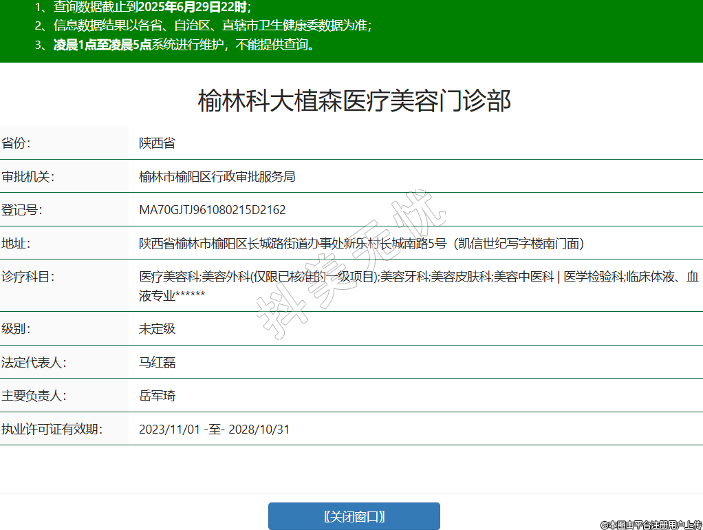 省份:陜西省審批機(jī)關(guān):榆林市榆陽區(qū)行政審批服務(wù)局登記號:MA70GJTJ961080215D2162地址:陜西省榆林市榆陽區(qū)長城路街道辦事處新樂村長城南路5號(凱信世紀(jì)寫字樓南門面)診療科目:醫(yī)療美容科;美容外科(僅限已核準(zhǔn)的一級項(xiàng)目);美容牙科;美容皮膚科;美容中醫(yī)科 | 醫(yī)學(xué)檢驗(yàn)科;臨床體液、血液專業(yè)******級別:未定級法定代表人:馬紅磊主要負(fù)責(zé)人:岳軍琦執(zhí)業(yè)許可證有效期:2023/11/01 -至- 2028/10/31 -