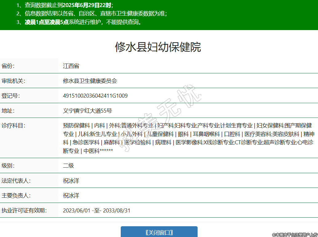 省份:江西省審批機(jī)關(guān):修水縣衛(wèi)生健康委員會(huì)登記號(hào):49151002036042411G1009地址:義寧鎮(zhèn)寧紅大道55號(hào)診療科目:預(yù)防保健科 | 內(nèi)科 | 外科;普通外科專業(yè) | 婦產(chǎn)科;婦科專業(yè);產(chǎn)科專業(yè);計(jì)劃生育專業(yè) | 婦女保健科;圍產(chǎn)期保健專業(yè) | 兒科;新生兒專業(yè) | 小兒外科 | 兒童保健科 | 眼科 | 耳鼻咽喉科 | 口腔科 | 醫(yī)療美容科;美容皮膚科 | 精神科 | 急診醫(yī)學(xué)科 | 麻醉科 | 醫(yī)學(xué)檢驗(yàn)科 | 病理科 | 醫(yī)學(xué)影像科;X線診斷專業(yè);CT診斷專業(yè);超聲診斷專業(yè);心電診斷專業(yè) | 中醫(yī)科******級(jí)別:二級(jí)法定代表人:祝冰洋主要負(fù)責(zé)人:祝冰洋執(zhí)業(yè)許可證有效期:2023/06/01 -至- 2033/08/31 -