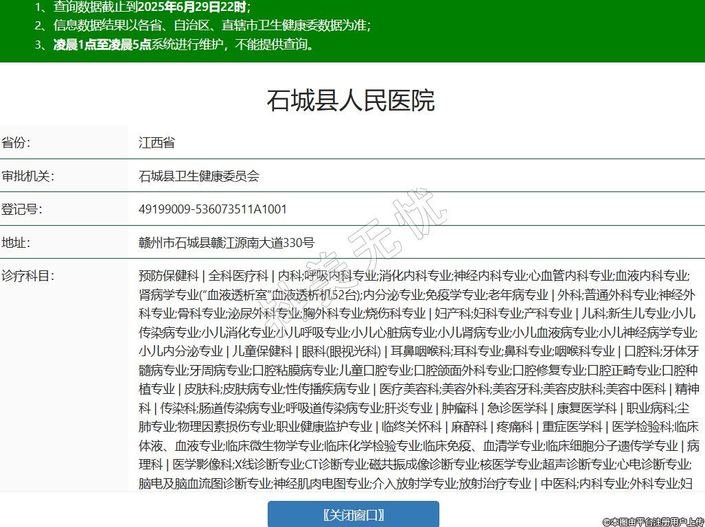 省份:江西省審批機(jī)關(guān):石城縣衛(wèi)生健康委員會(huì)登記號(hào):49199009-536073511A1001地址:贛州市石城縣贛江源南大道330號(hào)診療科目:預(yù)防保健科 | 全科醫(yī)療科 | 內(nèi)科;呼吸內(nèi)科專業(yè);消化內(nèi)科專業(yè);神經(jīng)內(nèi)科專業(yè);心血管內(nèi)科專業(yè);血液內(nèi)科專業(yè);腎病學(xué)專業(yè)(“血液透析室”血液透析機(jī)52臺(tái));內(nèi)分泌專業(yè);免疫學(xué)專業(yè);老年病專業(yè) | 外科;普通外科專業(yè);神經(jīng)外科專業(yè);骨科專業(yè);泌尿外科專業(yè);胸外科專業(yè);燒傷科專業(yè) | 婦產(chǎn)科;婦科專業(yè);產(chǎn)科專業(yè) | 兒科;新生兒專業(yè);小兒傳染病專業(yè);小兒消化專業(yè);小兒呼吸專業(yè);小兒心臟病專業(yè);小兒腎病專業(yè);小兒血液病專業(yè);小兒神經(jīng)病學(xué)專業(yè);小兒內(nèi)分泌專業(yè) | 兒童保健科 | 眼科(眼視光科) | 耳鼻咽喉科;耳科專業(yè);鼻科專業(yè);咽喉科專業(yè) | 口腔科;牙體牙髓病專業(yè);牙周病專業(yè);口腔粘膜病專業(yè);兒童口腔專業(yè);口腔頜面外科專業(yè);口腔修復(fù)專業(yè);口腔正畸專業(yè);口腔種植專業(yè) | 皮膚科;皮膚病專業(yè);性傳播疾病專業(yè) | 醫(yī)療美容科;美容外科;美容牙科;美容皮膚科;美容中醫(yī)科 | 精神科 | 傳染科;腸道傳染病專業(yè);呼吸道傳染病專業(yè);肝炎專業(yè) | 腫瘤科 | 急診醫(yī)學(xué)科 | 康復(fù)醫(yī)學(xué)科 | 職業(yè)病科;塵肺專業(yè);物理因素?fù)p傷專業(yè);職業(yè)健康監(jiān)護(hù)專業(yè) | 臨終關(guān)懷科 | 麻醉科 | 疼痛科 | 重癥醫(yī)學(xué)科 | 醫(yī)學(xué)檢驗(yàn)科;臨床體液、血液專業(yè);臨床微生物學(xué)專業(yè);臨床化學(xué)檢驗(yàn)專業(yè);臨床免疫、血清學(xué)專業(yè);臨床細(xì)胞分子遺傳學(xué)專業(yè) | 病理科 | 醫(yī)學(xué)影像科;X線診斷專業(yè);CT診斷專業(yè);磁共振成像診斷專業(yè);核醫(yī)學(xué)專業(yè);超聲診斷專業(yè);心電診斷專業(yè);腦電及腦血流圖診斷專業(yè);神經(jīng)肌肉電圖專業(yè);介入放射學(xué)專業(yè);放射治療專業(yè) | 中醫(yī)科;內(nèi)科專業(yè);外科專業(yè);婦產(chǎn)科專業(yè);兒科專業(yè);皮膚科專業(yè);腫瘤科專業(yè);骨傷科專業(yè);肛腸科專業(yè);老年病科專業(yè);針灸科專業(yè);推拿科專業(yè);康復(fù)醫(yī)學(xué)專業(yè);急診科專業(yè);預(yù)防保健科專業(yè) | 中西醫(yī)結(jié)合科******級(jí)別:三級(jí)法定代表人:吳優(yōu)明主要負(fù)責(zé)人:吳優(yōu)明執(zhí)業(yè)許可證有效期:2024/07/01 -至- 2029/06/30 -