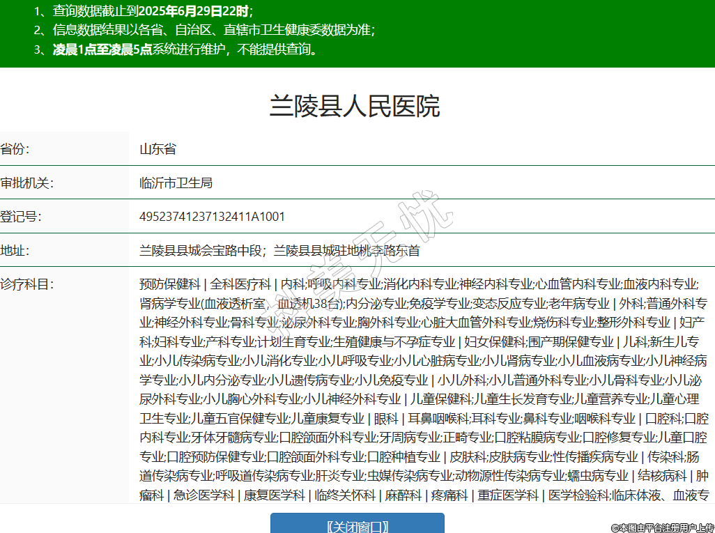 省份:山東省審批機(jī)關(guān):臨沂市衛(wèi)生局登記號:49523741237132411A1001地址:蘭陵縣縣城會寶路中段;蘭陵縣縣城駐地桃李路東首診療科目:預(yù)防保健科 | 全科醫(yī)療科 | 內(nèi)科;呼吸內(nèi)科專業(yè);消化內(nèi)科專業(yè);神經(jīng)內(nèi)科專業(yè);心血管內(nèi)科專業(yè);血液內(nèi)科專業(yè);腎病學(xué)專業(yè)(血液透析室,血透機(jī)38臺);內(nèi)分泌專業(yè);免疫學(xué)專業(yè);變態(tài)反應(yīng)專業(yè);老年病專業(yè) | 外科;普通外科專業(yè);神經(jīng)外科專業(yè);骨科專業(yè);泌尿外科專業(yè);胸外科專業(yè);心臟大血管外科專業(yè);燒傷科專業(yè);整形外科專業(yè) | 婦產(chǎn)科;婦科專業(yè);產(chǎn)科專業(yè);計劃生育專業(yè);生殖健康與不孕癥專業(yè) | 婦女保健科;圍產(chǎn)期保健專業(yè) | 兒科;新生兒專業(yè);小兒傳染病專業(yè);小兒消化專業(yè);小兒呼吸專業(yè);小兒心臟病專業(yè);小兒腎病專業(yè);小兒血液病專業(yè);小兒神經(jīng)病學(xué)專業(yè);小兒內(nèi)分泌專業(yè);小兒遺傳病專業(yè);小兒免疫專業(yè) | 小兒外科;小兒普通外科專業(yè);小兒骨科專業(yè);小兒泌尿外科專業(yè);小兒胸心外科專業(yè);小兒神經(jīng)外科專業(yè) | 兒童保健科;兒童生長發(fā)育專業(yè);兒童營養(yǎng)專業(yè);兒童心理衛(wèi)生專業(yè);兒童五官保健專業(yè);兒童康復(fù)專業(yè) | 眼科 | 耳鼻咽喉科;耳科專業(yè);鼻科專業(yè);咽喉科專業(yè) | 口腔科;口腔內(nèi)科專業(yè);牙體牙髓病專業(yè);口腔頜面外科專業(yè);牙周病專業(yè);正畸專業(yè);口腔粘膜病專業(yè);口腔修復(fù)專業(yè);兒童口腔專業(yè);口腔預(yù)防保健專業(yè);口腔頜面外科專業(yè);口腔種植專業(yè) | 皮膚科;皮膚病專業(yè);性傳播疾病專業(yè) | 傳染科;腸道傳染病專業(yè);呼吸道傳染病專業(yè);肝炎專業(yè);蟲媒傳染病專業(yè);動物源性傳染病專業(yè);蠕蟲病專業(yè) | 結(jié)核病科 | 腫瘤科 | 急診醫(yī)學(xué)科 | 康復(fù)醫(yī)學(xué)科 | 臨終關(guān)懷科 | 麻醉科 | 疼痛科 | 重癥醫(yī)學(xué)科 | 醫(yī)學(xué)檢驗科;臨床體液、血液專業(yè);臨床微生物學(xué)專業(yè);臨床化學(xué)檢驗專業(yè);臨床免疫、血清學(xué)專業(yè);臨床細(xì)胞分子遺傳學(xué)專業(yè) | 病理科 | 醫(yī)學(xué)影像科;X線診斷專業(yè);CT診斷專業(yè);磁共振成像診斷專業(yè);核醫(yī)學(xué)專業(yè);超聲診斷專業(yè);心電診斷專業(yè);腦電及腦血流圖診斷專業(yè);神經(jīng)肌肉電圖專業(yè);介入放射學(xué)專業(yè);放射治療專業(yè) | 中醫(yī)科;內(nèi)科專業(yè);外科專業(yè);婦產(chǎn)科專業(yè);兒科專業(yè);皮膚科專業(yè);眼科專業(yè);耳鼻咽喉科專業(yè);口腔科專業(yè);腫瘤科專業(yè);骨傷科專業(yè);肛腸科專業(yè);老年病科專業(yè);針灸科專業(yè);推拿科專業(yè);康復(fù)醫(yī)學(xué)專業(yè);急診科專業(yè);預(yù)防保健科專業(yè) | 中西醫(yī)結(jié)合科******級別:二級法定代表人:秦西平主要負(fù)責(zé)人:高巖執(zhí)業(yè)許可證有效期:2025/03/11 -至- 2029/12/31 -