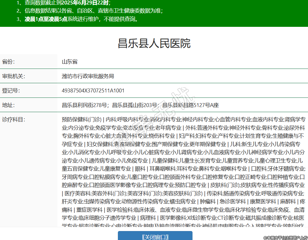 省份:山東省審批機關(guān):濰坊市行政審批服務(wù)局登記號:49387504X37072511A1001地址:昌樂縣利民街278號;昌樂縣孤山街203號;昌樂縣新昌路5127號A座診療科目:預(yù)防保健科(門診) | 內(nèi)科;呼吸內(nèi)科專業(yè);消化內(nèi)科專業(yè);神經(jīng)內(nèi)科專業(yè);心血管內(nèi)科專業(yè);血液內(nèi)科專業(yè);腎病學(xué)專業(yè);內(nèi)分泌專業(yè);免疫學(xué)專業(yè);變態(tài)反應(yīng)專業(yè);老年病專業(yè) | 外科;普通外科專業(yè);神經(jīng)外科專業(yè);骨科專業(yè);泌尿外科專業(yè);胸外科專業(yè);心臟大血管外科專業(yè);燒傷科專業(yè) | 婦產(chǎn)科;婦科專業(yè);產(chǎn)科專業(yè);計劃生育專業(yè);生殖健康與不孕癥專業(yè) | 婦女保健科;青春期保健專業(yè);圍產(chǎn)期保健專業(yè);更年期保健專業(yè) | 兒科;新生兒專業(yè);小兒傳染病專業(yè);小兒消化專業(yè);小兒呼吸專業(yè);小兒心臟病專業(yè);小兒腎病專業(yè);小兒血液病專業(yè);小兒神經(jīng)病學(xué)專業(yè);小兒內(nèi)分泌專業(yè);小兒遺傳病專業(yè);小兒免疫專業(yè) | 兒童保健科;兒童生長發(fā)育專業(yè);兒童營養(yǎng)專業(yè);兒童心理衛(wèi)生專業(yè);兒童五官保健專業(yè);兒童康復(fù)專業(yè) | 眼科 | 耳鼻咽喉科;耳科專業(yè);鼻科專業(yè);咽喉科專業(yè) | 口腔科;牙體牙髓病專業(yè);牙周病專業(yè);口腔粘膜病專業(yè);兒童口腔專業(yè);口腔頜面外科專業(yè);口腔修復(fù)專業(yè);口腔正畸專業(yè);口腔種植專業(yè);口腔麻醉專業(yè);口腔頜面醫(yī)學(xué)影像專業(yè);口腔病理專業(yè);預(yù)防口腔專業(yè) | 皮膚科(門診);皮膚病專業(yè);性傳播疾病專業(yè) | 醫(yī)療美容科;美容外科(門診);美容牙科(門診);美容皮膚科(門診) | 傳染科;腸道傳染病專業(yè);呼吸道傳染病專業(yè);肝炎專業(yè);蟲媒傳染病專業(yè);動物源性傳染病專業(yè);蠕蟲病專業(yè) | 腫瘤科 | 急診醫(yī)學(xué)科 | 康復(fù)醫(yī)學(xué)科 | 麻醉科 | 疼痛科 | 重癥醫(yī)學(xué)科 | 醫(yī)學(xué)檢驗科;臨床體液、血液專業(yè);臨床微生物學(xué)專業(yè);臨床化學(xué)檢驗專業(yè);臨床免疫、血清學(xué)專業(yè);臨床細胞分子遺傳學(xué)專業(yè) | 病理科 | 醫(yī)學(xué)影像科;X線診斷專業(yè);CT診斷專業(yè);磁共振成像診斷專業(yè);核醫(yī)學(xué)專業(yè);超聲診斷專業(yè);心電診斷專業(yè);腦電及腦血流圖診斷專業(yè);神經(jīng)肌肉電圖專業(yè);介入放射學(xué)專業(yè);放射治療專業(yè) | 中醫(yī)科;內(nèi)科專業(yè);推拿科專業(yè);康復(fù)醫(yī)學(xué)專業(yè)******級別:二級法定代表人:肖榮偉主要負責(zé)人:肖榮偉執(zhí)業(yè)許可證有效期:2025/01/09 -至- 2035/10/08 -