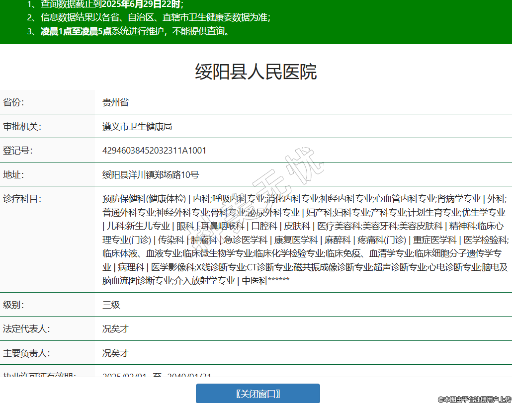 省份:貴州省審批機(jī)關(guān):遵義市衛(wèi)生健康局登記號(hào):42946038452032311A1001地址:綏陽(yáng)縣洋川鎮(zhèn)鄭場(chǎng)路10號(hào)診療科目:預(yù)防保健科(健康體檢) | 內(nèi)科;呼吸內(nèi)科專(zhuān)業(yè);消化內(nèi)科專(zhuān)業(yè);神經(jīng)內(nèi)科專(zhuān)業(yè);心血管內(nèi)科專(zhuān)業(yè);腎病學(xué)專(zhuān)業(yè) | 外科;普通外科專(zhuān)業(yè);神經(jīng)外科專(zhuān)業(yè);骨科專(zhuān)業(yè);泌尿外科專(zhuān)業(yè) | 婦產(chǎn)科;婦科專(zhuān)業(yè);產(chǎn)科專(zhuān)業(yè);計(jì)劃生育專(zhuān)業(yè);優(yōu)生學(xué)專(zhuān)業(yè) | 兒科;新生兒專(zhuān)業(yè) | 眼科 | 耳鼻咽喉科 | 口腔科 | 皮膚科 | 醫(yī)療美容科;美容牙科;美容皮膚科 | 精神科;臨床心理專(zhuān)業(yè)(門(mén)診) | 傳染科 | 腫瘤科 | 急診醫(yī)學(xué)科 | 康復(fù)醫(yī)學(xué)科 | 麻醉科 | 疼痛科(門(mén)診) | 重癥醫(yī)學(xué)科 | 醫(yī)學(xué)檢驗(yàn)科;臨床體液、血液專(zhuān)業(yè);臨床微生物學(xué)專(zhuān)業(yè);臨床化學(xué)檢驗(yàn)專(zhuān)業(yè);臨床免疫、血清學(xué)專(zhuān)業(yè);臨床細(xì)胞分子遺傳學(xué)專(zhuān)業(yè) | 病理科 | 醫(yī)學(xué)影像科;X線診斷專(zhuān)業(yè);CT診斷專(zhuān)業(yè);磁共振成像診斷專(zhuān)業(yè);超聲診斷專(zhuān)業(yè);心電診斷專(zhuān)業(yè);腦電及腦血流圖診斷專(zhuān)業(yè);介入放射學(xué)專(zhuān)業(yè) | 中醫(yī)科******級(jí)別:三級(jí)法定代表人:況矣才主要負(fù)責(zé)人:況矣才執(zhí)業(yè)許可證有效期:2025/02/01 -至- 2040/01/31 -