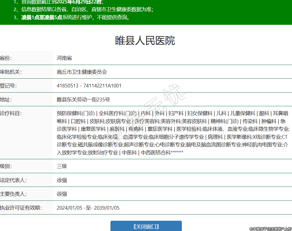 省份:河南省審批機(jī)關(guān):商丘市衛(wèi)生健康委員會(huì)登記號:41850513-741142211A1001地址:睢縣東關(guān)勞動(dòng)一街235號診療科目:預(yù)防保健科(門診) | 全科醫(yī)療科(門診) | 內(nèi)科 | 外科 | 婦產(chǎn)科 | 婦女保健科 | 兒科 | 兒童保健科 | 眼科 | 耳鼻咽喉科 | 口腔科 | 皮膚科;皮膚病專業(yè) | 醫(yī)療美容科;美容外科;美容皮膚科 | 精神科(門診) | 傳染科 | 腫瘤科 | 急診醫(yī)學(xué)科 | 康復(fù)醫(yī)學(xué)科 | 麻醉科 | 疼痛科 | 重癥醫(yī)學(xué)科 | 醫(yī)學(xué)檢驗(yàn)科;臨床體液、血液專業(yè);臨床微生物學(xué)專業(yè);臨床化學(xué)檢驗(yàn)專業(yè);臨床免疫、血清學(xué)專業(yè);臨床細(xì)胞分子遺傳學(xué)專業(yè) | 病理科 | 醫(yī)學(xué)影像科;X線診斷專業(yè);CT診斷專業(yè);磁共振成像診斷專業(yè);超聲診斷專業(yè);心電診斷專業(yè);腦電及腦血流圖診斷專業(yè);神經(jīng)肌肉電圖專業(yè);介入放射學(xué)專業(yè);放射治療專業(yè) | 中醫(yī)科 | 中西醫(yī)結(jié)合科******級別:三級法定代表人:徐強(qiáng)主要負(fù)責(zé)人:徐強(qiáng)執(zhí)業(yè)許可證有效期:2024/01/05 -至- 2039/01/05 -