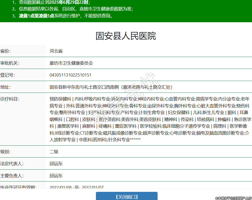 省份:河北省審批機(jī)關(guān):廊坊市衛(wèi)生健康委員會(huì)登記號(hào):043051131022510151地址:固安縣新中東街與禮士路交口西南側(cè)(廊涿老路與禮士路交匯處)診療科目:預(yù)防保健科 | 內(nèi)科;呼吸內(nèi)科專業(yè);消化內(nèi)科專業(yè);神經(jīng)內(nèi)科專業(yè);心血管內(nèi)科專業(yè);腎病學(xué)專業(yè);內(nèi)分泌專業(yè);老年病專業(yè) | 外科;普通外科專業(yè);神經(jīng)外科專業(yè);骨科專業(yè);泌尿外科專業(yè);胸外科專業(yè);心臟大血管外科專業(yè);燒傷科專業(yè);整形外科專業(yè) | 婦產(chǎn)科;婦科專業(yè);產(chǎn)科專業(yè);計(jì)劃生育專業(yè) | 婦女保健科 | 兒科;新生兒專業(yè) | 眼科 | 耳鼻咽喉科 | 口腔科 | 皮膚科 | 醫(yī)療美容科;美容外科;美容皮膚科 | 精神科 | 傳染科 | 結(jié)核病科 | 腫瘤科 | 急診醫(yī)學(xué)科 | 康復(fù)醫(yī)學(xué)科 | 麻醉科 | 疼痛科 | 重癥醫(yī)學(xué)科 | 醫(yī)學(xué)檢驗(yàn)科;臨床細(xì)胞分子遺傳學(xué)專業(yè) | 病理科 | 醫(yī)學(xué)影像科;X線診斷專業(yè);CT診斷專業(yè);磁共振成像診斷專業(yè);超聲診斷專業(yè);心電診斷專業(yè);腦電及腦血流圖診斷專業(yè);介入放射學(xué)專業(yè) | 中醫(yī)科(藥劑科);針灸科專業(yè)******級(jí)別:二級(jí)法定代表人:邱運(yùn)東主要負(fù)責(zé)人:邱運(yùn)東執(zhí)業(yè)許可證有效期:2022/01/08 -至- 2037/01/07 -