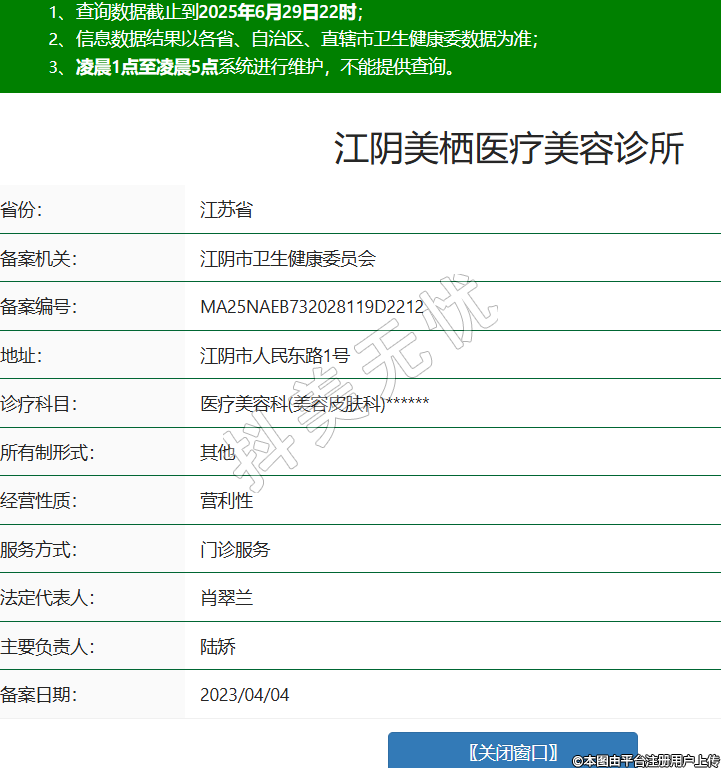 江陰美棲醫(yī)療美容診所,診療科目:醫(yī)療美容科(美容皮膚科)******