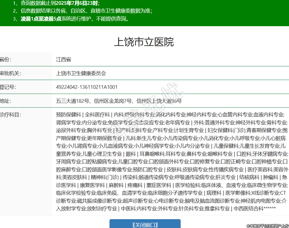 省份:江西省審批機關(guān):上饒市衛(wèi)生健康委員會登記號:49224042-136110211A1001地址:五三大道182號、信州區(qū)金龍崗7號、信州區(qū)上饒大道96號診療科目:預(yù)防保健科 | 全科醫(yī)療科 | 內(nèi)科;呼吸內(nèi)科專業(yè);消化內(nèi)科專業(yè);神經(jīng)內(nèi)科專業(yè);心血管內(nèi)科專業(yè);血液內(nèi)科專業(yè);腎病學(xué)專業(yè);內(nèi)分泌專業(yè);免疫學(xué)專業(yè);變態(tài)反應(yīng)專業(yè);老年病專業(yè) | 外科;普通外科專業(yè);神經(jīng)外科專業(yè);骨科專業(yè);泌尿外科專業(yè);胸外科專業(yè) | 婦產(chǎn)科;婦科專業(yè);產(chǎn)科專業(yè);計劃生育專業(yè) | 婦女保健科(門診);青春期保健專業(yè);圍產(chǎn)期保健專業(yè);更年期保健專業(yè) | 兒科;新生兒專業(yè);小兒傳染病專業(yè);小兒消化專業(yè);小兒呼吸專業(yè);小兒心臟病專業(yè);小兒腎病專業(yè);小兒血液病專業(yè);小兒神經(jīng)病學(xué)專業(yè);小兒內(nèi)分泌專業(yè) | 兒童保健科;兒童生長發(fā)育專業(yè);兒童營養(yǎng)專業(yè);兒童心理衛(wèi)生專業(yè) | 眼科 | 耳鼻咽喉科;耳科專業(yè);鼻科專業(yè);咽喉科專業(yè) | 口腔科;牙體牙髓病專業(yè);牙周病專業(yè);口腔粘膜病專業(yè);兒童口腔專業(yè);口腔頜面外科專業(yè);口腔修復(fù)專業(yè);口腔正畸專業(yè);口腔種植專業(yè);口腔麻醉專業(yè);口腔頜面醫(yī)學(xué)影像專業(yè);預(yù)防口腔專業(yè) | 皮膚科;皮膚病專業(yè);性傳播疾病專業(yè) | 醫(yī)療美容科;美容外科;美容皮膚科 | 精神科(門診) | 傳染科;腸道傳染病專業(yè);呼吸道傳染病專業(yè);肝炎專業(yè) | 結(jié)核病科 | 腫瘤科 | 急診醫(yī)學(xué)科 | 康復(fù)醫(yī)學(xué)科 | 麻醉科 | 疼痛科 | 重癥醫(yī)學(xué)科 | 醫(yī)學(xué)檢驗科;臨床體液、血液專業(yè);臨床微生物學(xué)專業(yè);臨床化學(xué)檢驗專業(yè);臨床免疫、血清學(xué)專業(yè);臨床細胞分子遺傳學(xué)專業(yè) | 病理科 | 醫(yī)學(xué)影像科;X線診斷專業(yè);CT診斷專業(yè);磁共振成像診斷專業(yè);超聲診斷專業(yè);心電診斷專業(yè);腦電及腦血流圖診斷專業(yè);神經(jīng)肌肉電圖專業(yè);介入放射學(xué)專業(yè);放射治療專業(yè) | 中醫(yī)科;內(nèi)科專業(yè);外科專業(yè);針灸科專業(yè);推拿科專業(yè) | 中西醫(yī)結(jié)合科******級別:三級法定代表人:劉和開主要負責(zé)人:劉和開執(zhí)業(yè)許可證有效期:2015/11/01 -至- 2030/10/31 -