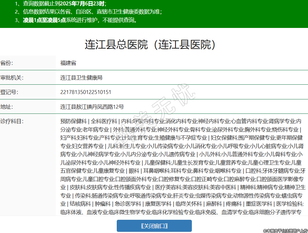 省份:福建省審批機(jī)關(guān):連江縣衛(wèi)生健康局登記號(hào):221781350122510151地址:連江縣敖江鎮(zhèn)丹鳳西路12號(hào)診療科目:預(yù)防保健科 | 全科醫(yī)療科 | 內(nèi)科;呼吸內(nèi)科專業(yè);消化內(nèi)科專業(yè);神經(jīng)內(nèi)科專業(yè);心血管內(nèi)科專業(yè);腎病學(xué)專業(yè);內(nèi)分泌專業(yè);老年病專業(yè) | 外科;普通外科專業(yè);神經(jīng)外科專業(yè);骨科專業(yè);泌尿外科專業(yè);胸外科專業(yè);燒傷科專業(yè) | 婦產(chǎn)科;婦科專業(yè);產(chǎn)科專業(yè);計(jì)劃生育專業(yè);生殖健康與不孕癥專業(yè) | 婦女保健科;圍產(chǎn)期保健專業(yè);更年期保健專業(yè);婦女營(yíng)養(yǎng)專業(yè) | 兒科;新生兒專業(yè);小兒傳染病專業(yè);小兒消化專業(yè);小兒呼吸專業(yè);小兒心臟病專業(yè);小兒腎病專業(yè);小兒神經(jīng)病學(xué)專業(yè);小兒內(nèi)分泌專業(yè);小兒遺傳病專業(yè) | 小兒外科;小兒普通外科專業(yè);小兒骨科專業(yè);小兒泌尿外科專業(yè);小兒神經(jīng)外科專業(yè) | 兒童保健科;兒童生長(zhǎng)發(fā)育專業(yè);兒童營(yíng)養(yǎng)專業(yè);兒童心理衛(wèi)生專業(yè);兒童五官保健專業(yè);兒童康復(fù)專業(yè) | 眼科 | 耳鼻咽喉科;耳科專業(yè);鼻科專業(yè);咽喉科專業(yè) | 口腔科;牙體牙髓病專業(yè);牙周病專業(yè);兒童口腔專業(yè);口腔頜面外科專業(yè);口腔修復(fù)專業(yè);口腔正畸專業(yè);口腔麻醉專業(yè);口腔頜面醫(yī)學(xué)影像專業(yè) | 皮膚科;皮膚病專業(yè);性傳播疾病專業(yè) | 醫(yī)療美容科;美容皮膚科;美容中醫(yī)科 | 精神科;精神病專業(yè);精神衛(wèi)生專業(yè) | 傳染科;腸道傳染病專業(yè);呼吸道傳染病專業(yè);肝炎專業(yè);蟲媒傳染病專業(yè);動(dòng)物源性傳染病專業(yè);蠕蟲病專業(yè) | 結(jié)核病科 | 腫瘤科 | 急診醫(yī)學(xué)科 | 康復(fù)醫(yī)學(xué)科 | 臨終關(guān)懷科 | 麻醉科 | 疼痛科 | 重癥醫(yī)學(xué)科 | 醫(yī)學(xué)檢驗(yàn)科;臨床體液、血液專業(yè);臨床微生物學(xué)專業(yè);臨床化學(xué)檢驗(yàn)專業(yè);臨床免疫、血清學(xué)專業(yè);臨床細(xì)胞分子遺傳學(xué)專業(yè) | 病理科 | 醫(yī)學(xué)影像科;X線診斷專業(yè);CT診斷專業(yè);磁共振成像診斷專業(yè);超聲診斷專業(yè);心電診斷專業(yè);腦電及腦血流圖診斷專業(yè);介入放射學(xué)專業(yè) | 中醫(yī)科;內(nèi)科專業(yè);外科專業(yè);婦產(chǎn)科專業(yè);兒科專業(yè);腫瘤科專業(yè);骨傷科專業(yè);肛腸科專業(yè);老年病科專業(yè);針灸科專業(yè);推拿科專業(yè);康復(fù)醫(yī)學(xué)專業(yè);急診科專業(yè) | 中西醫(yī)結(jié)合科******級(jí)別:二級(jí)法定代表人:鄭宇韜主要負(fù)責(zé)人:鄭宇韜執(zhí)業(yè)許可證有效期:2025/02/08 -至- 2031/02/07 -