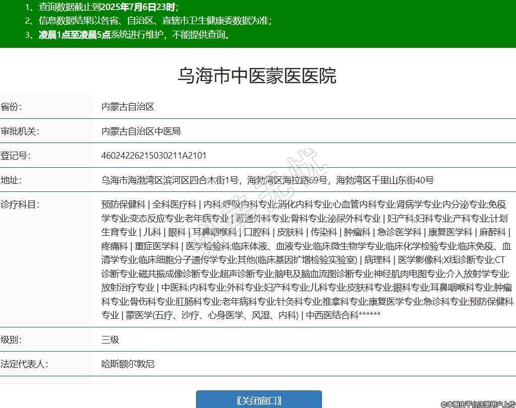 省份:內(nèi)蒙古自治區(qū)審批機(jī)關(guān):內(nèi)蒙古自治區(qū)中醫(yī)局登記號:46024226215030211A2101地址:烏海市海渤灣區(qū)濱河區(qū)四合木街1號,海勃灣區(qū)海拉路69號,海勃灣區(qū)千里山東街40號診療科目:預(yù)防保健科 | 全科醫(yī)療科 | 內(nèi)科;呼吸內(nèi)科專業(yè);消化內(nèi)科專業(yè);心血管內(nèi)科專業(yè);腎病學(xué)專業(yè);內(nèi)分泌專業(yè);免疫學(xué)專業(yè);變態(tài)反應(yīng)專業(yè);老年病專業(yè) | 普通外科專業(yè);骨科專業(yè);泌尿外科專業(yè) | 婦產(chǎn)科;婦科專業(yè);產(chǎn)科專業(yè);計(jì)劃生育專業(yè) | 兒科 | 眼科 | 耳鼻咽喉科 | 口腔科 | 皮膚科 | 傳染科 | 腫瘤科 | 急診醫(yī)學(xué)科 | 康復(fù)醫(yī)學(xué)科 | 麻醉科 | 疼痛科 | 重癥醫(yī)學(xué)科 | 醫(yī)學(xué)檢驗(yàn)科;臨床體液、血液專業(yè);臨床微生物學(xué)專業(yè);臨床化學(xué)檢驗(yàn)專業(yè);臨床免疫、血清學(xué)專業(yè);臨床細(xì)胞分子遺傳學(xué)專業(yè);其他(臨床基因擴(kuò)增檢驗(yàn)實(shí)驗(yàn)室) | 病理科 | 醫(yī)學(xué)影像科;X線診斷專業(yè);CT診斷專業(yè);磁共振成像診斷專業(yè);超聲診斷專業(yè);腦電及腦血流圖診斷專業(yè);神經(jīng)肌肉電圖專業(yè);介入放射學(xué)專業(yè);放射治療專業(yè) | 中醫(yī)科;內(nèi)科專業(yè);外科專業(yè);婦產(chǎn)科專業(yè);兒科專業(yè);皮膚科專業(yè);眼科專業(yè);耳鼻咽喉科專業(yè);腫瘤科專業(yè);骨傷科專業(yè);肛腸科專業(yè);老年病科專業(yè);針灸科專業(yè);推拿科專業(yè);康復(fù)醫(yī)學(xué)專業(yè);急診科專業(yè);預(yù)防保健科專業(yè) | 蒙醫(yī)學(xué)(五療、沙療、心身醫(yī)學(xué)、風(fēng)濕、內(nèi)科) | 中西醫(yī)結(jié)合科******級別:三級法定代表人:哈斯額爾敦尼主要負(fù)責(zé)人:哈斯額爾敦尼執(zhí)業(yè)許可證有效期:2025/05/30 -至- 2028/05/30 -