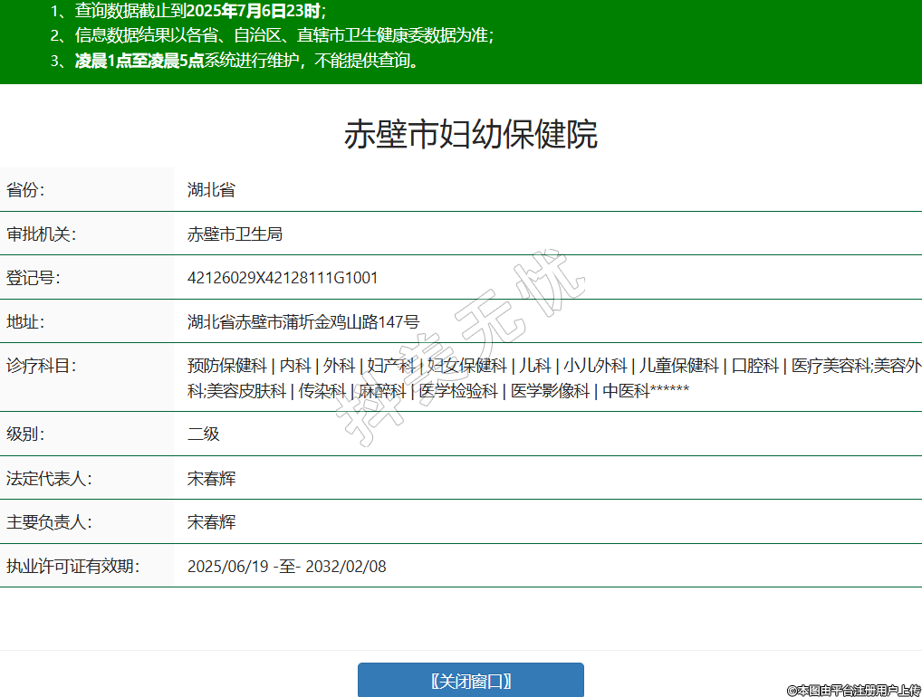 省份:湖北省審批機(jī)關(guān):赤壁市衛(wèi)生局登記號(hào):42126029X42128111G1001地址:湖北省赤壁市蒲圻金雞山路147號(hào)診療科目:預(yù)防保健科 | 內(nèi)科 | 外科 | 婦產(chǎn)科 | 婦女保健科 | 兒科 | 小兒外科 | 兒童保健科 | 口腔科 | 醫(yī)療美容科;美容外科;美容皮膚科 | 傳染科 | 麻醉科 | 醫(yī)學(xué)檢驗(yàn)科 | 醫(yī)學(xué)影像科 | 中醫(yī)科******級(jí)別:二級(jí)法定代表人:宋春輝主要負(fù)責(zé)人:宋春輝執(zhí)業(yè)許可證有效期:2025/06/19 -至- 2032/02/08 -