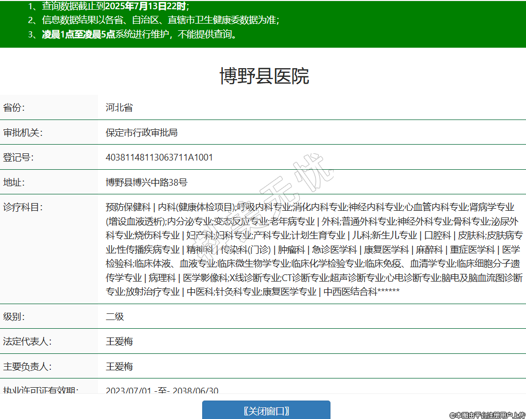 省份:河北省審批機(jī)關(guān):保定市行政審批局登記號(hào):40381148113063711A1001地址:博野縣博興中路38號(hào)診療科目:預(yù)防保健科 | 內(nèi)科(健康體檢項(xiàng)目);呼吸內(nèi)科專業(yè);消化內(nèi)科專業(yè);神經(jīng)內(nèi)科專業(yè);心血管內(nèi)科專業(yè);腎病學(xué)專業(yè)(增設(shè)血液透析);內(nèi)分泌專業(yè);變態(tài)反應(yīng)專業(yè);老年病專業(yè) | 外科;普通外科專業(yè);神經(jīng)外科專業(yè);骨科專業(yè);泌尿外科專業(yè);燒傷科專業(yè) | 婦產(chǎn)科;婦科專業(yè);產(chǎn)科專業(yè);計(jì)劃生育專業(yè) | 兒科;新生兒專業(yè) | 口腔科 | 皮膚科;皮膚病專業(yè);性傳播疾病專業(yè) | 精神科 | 傳染科(門診) | 腫瘤科 | 急診醫(yī)學(xué)科 | 康復(fù)醫(yī)學(xué)科 | 麻醉科 | 重癥醫(yī)學(xué)科 | 醫(yī)學(xué)檢驗(yàn)科;臨床體液、血液專業(yè);臨床微生物學(xué)專業(yè);臨床化學(xué)檢驗(yàn)專業(yè);臨床免疫、血清學(xué)專業(yè);臨床細(xì)胞分子遺傳學(xué)專業(yè) | 病理科 | 醫(yī)學(xué)影像科;X線診斷專業(yè);CT診斷專業(yè);超聲診斷專業(yè);心電診斷專業(yè);腦電及腦血流圖診斷專業(yè);放射治療專業(yè) | 中醫(yī)科;針灸科專業(yè);康復(fù)醫(yī)學(xué)專業(yè) | 中西醫(yī)結(jié)合科******級(jí)別:二級(jí)法定代表人:王愛梅主要負(fù)責(zé)人:王愛梅執(zhí)業(yè)許可證有效期:2023/07/01 -至- 2038/06/30 -