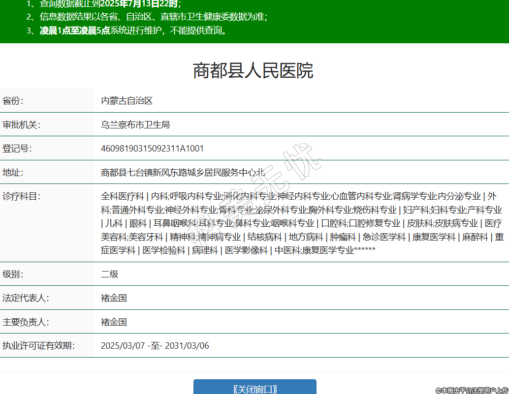 省份:內(nèi)蒙古自治區(qū)審批機(jī)關(guān):烏蘭察布市衛(wèi)生局登記號:46098190315092311A1001地址:商都縣七臺鎮(zhèn)新風(fēng)東路城鄉(xiāng)居民服務(wù)中心北診療科目:全科醫(yī)療科 | 內(nèi)科;呼吸內(nèi)科專業(yè);消化內(nèi)科專業(yè);神經(jīng)內(nèi)科專業(yè);心血管內(nèi)科專業(yè);腎病學(xué)專業(yè);內(nèi)分泌專業(yè) | 外科;普通外科專業(yè);神經(jīng)外科專業(yè);骨科專業(yè);泌尿外科專業(yè);胸外科專業(yè);燒傷科專業(yè) | 婦產(chǎn)科;婦科專業(yè);產(chǎn)科專業(yè) | 兒科 | 眼科 | 耳鼻咽喉科;耳科專業(yè);鼻科專業(yè);咽喉科專業(yè) | 口腔科;口腔修復(fù)專業(yè) | 皮膚科;皮膚病專業(yè) | 醫(yī)療美容科;美容牙科 | 精神科;精神病專業(yè) | 結(jié)核病科 | 地方病科 | 腫瘤科 | 急診醫(yī)學(xué)科 | 康復(fù)醫(yī)學(xué)科 | 麻醉科 | 重癥醫(yī)學(xué)科 | 醫(yī)學(xué)檢驗(yàn)科 | 病理科 | 醫(yī)學(xué)影像科 | 中醫(yī)科;康復(fù)醫(yī)學(xué)專業(yè)******級別:二級法定代表人:褚金國主要負(fù)責(zé)人:褚金國執(zhí)業(yè)許可證有效期:2025/03/07 -至- 2031/03/06 -