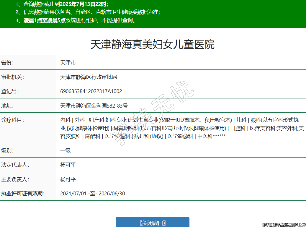 天津靜海真美婦女兒童醫(yī)院,診療科目:內科 | 外科 | 婦產科;婦科專業(yè);計劃生育專業(yè)(僅限于IUD置取術、負壓吸宮術) | 兒科 | 眼科(以五官科形式執(zhí)業(yè),僅限健康體檢使用) | 耳鼻咽喉科(以五官科形式執(zhí)業(yè),僅限健康體檢使用) | 口腔科 | 醫(yī)療美容科;美容外科;美容皮膚科 | 麻醉科 | 醫(yī)學檢驗科 | 病理科(協(xié)議) | 醫(yī)學影像科 | 中醫(yī)科******
