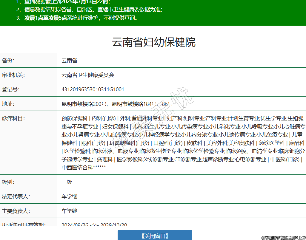 省份:云南省審批機關:云南省衛(wèi)生健康委員會登記號:43120196353010311G1001地址:昆明市鼓樓路200號、昆明市鼓樓路184號、86號診療科目:預防保健科 | 內科(門診) | 外科;普通外科專業(yè) | 婦產科;婦科專業(yè);產科專業(yè);計劃生育專業(yè);優(yōu)生學專業(yè);生殖健康與不孕癥專業(yè) | 婦女保健科 | 兒科;新生兒專業(yè);小兒傳染病專業(yè);小兒消化專業(yè);小兒呼吸專業(yè);小兒心臟病專業(yè);小兒腎病專業(yè);小兒血液病專業(yè);小兒神經病學專業(yè);小兒內分泌專業(yè);小兒遺傳病專業(yè);小兒免疫專業(yè) | 兒童保健科 | 眼科(門診) | 耳鼻咽喉科(門診) | 口腔科(門診) | 皮膚科 | 美容外科;美容皮膚科 | 急診醫(yī)學科 | 麻醉科 | 醫(yī)學檢驗科;臨床體液、血液專業(yè);臨床微生物學專業(yè);臨床化學檢驗專業(yè);臨床免疫、血清學專業(yè);臨床細胞分子遺傳學專業(yè) | 病理科 | 醫(yī)學影像科;X線診斷專業(yè);CT診斷專業(yè);超聲診斷專業(yè);心電診斷專業(yè) | 中醫(yī)科(門診) | 中西醫(yī)結合科******級別:三級法定代表人:車學繼主要負責人:車學繼執(zhí)業(yè)許可證有效期:2024/09/26 -至- 2039/10/20 -