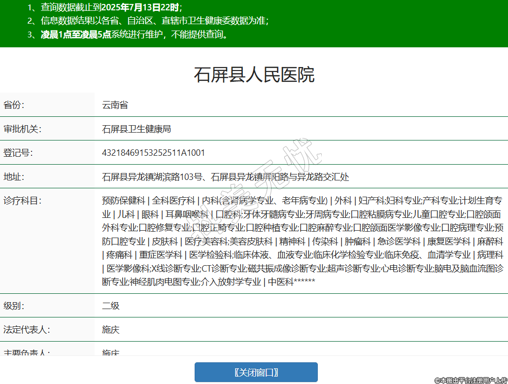 省份:云南省審批機(jī)關(guān):石屏縣衛(wèi)生健康局登記號:43218469153252511A1001地址:石屏縣異龍鎮(zhèn)湖濱路103號、石屏縣異龍鎮(zhèn)屏陽路與異龍路交匯處診療科目:預(yù)防保健科 | 全科醫(yī)療科 | 內(nèi)科(含腎病學(xué)專業(yè)、老年病專業(yè)) | 外科 | 婦產(chǎn)科;婦科專業(yè);產(chǎn)科專業(yè);計劃生育專業(yè) | 兒科 | 眼科 | 耳鼻咽喉科 | 口腔科;牙體牙髓病專業(yè);牙周病專業(yè);口腔粘膜病專業(yè);兒童口腔專業(yè);口腔頜面外科專業(yè);口腔修復(fù)專業(yè);口腔正畸專業(yè);口腔種植專業(yè);口腔麻醉專業(yè);口腔頜面醫(yī)學(xué)影像專業(yè);口腔病理專業(yè);預(yù)防口腔專業(yè) | 皮膚科 | 醫(yī)療美容科;美容皮膚科 | 精神科 | 傳染科 | 腫瘤科 | 急診醫(yī)學(xué)科 | 康復(fù)醫(yī)學(xué)科 | 麻醉科 | 疼痛科 | 重癥醫(yī)學(xué)科 | 醫(yī)學(xué)檢驗科;臨床體液、血液專業(yè);臨床化學(xué)檢驗專業(yè);臨床免疫、血清學(xué)專業(yè) | 病理科 | 醫(yī)學(xué)影像科;X線診斷專業(yè);CT診斷專業(yè);磁共振成像診斷專業(yè);超聲診斷專業(yè);心電診斷專業(yè);腦電及腦血流圖診斷專業(yè);神經(jīng)肌肉電圖專業(yè);介入放射學(xué)專業(yè) | 中醫(yī)科******級別:二級法定代表人:施慶主要負(fù)責(zé)人:施慶執(zhí)業(yè)許可證有效期:2025/06/12 -至- 2038/11/30 -