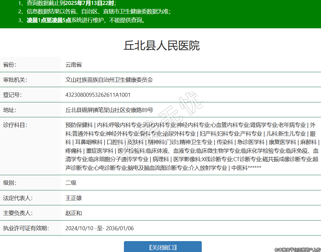 省份:云南省審批機(jī)關(guān):文山壯族苗族自治州衛(wèi)生健康委員會登記號:43230800953262611A1001地址:丘北縣錦屏鎮(zhèn)筆架山社區(qū)安康路89號診療科目:預(yù)防保健科 | 內(nèi)科;呼吸內(nèi)科專業(yè);消化內(nèi)科專業(yè);神經(jīng)內(nèi)科專業(yè);心血管內(nèi)科專業(yè);腎病學(xué)專業(yè);老年病專業(yè) | 外科;普通外科專業(yè);神經(jīng)外科專業(yè);骨科專業(yè);泌尿外科專業(yè) | 婦產(chǎn)科;婦科專業(yè);產(chǎn)科專業(yè) | 兒科;新生兒專業(yè) | 眼科 | 耳鼻咽喉科 | 口腔科 | 皮膚科 | 精神科(門診);精神衛(wèi)生專業(yè) | 傳染科 | 急診醫(yī)學(xué)科 | 康復(fù)醫(yī)學(xué)科 | 麻醉科 | 疼痛科 | 重癥醫(yī)學(xué)科 | 醫(yī)學(xué)檢驗科;臨床體液、血液專業(yè);臨床微生物學(xué)專業(yè);臨床化學(xué)檢驗專業(yè);臨床免疫、血清學(xué)專業(yè);臨床細(xì)胞分子遺傳學(xué)專業(yè) | 病理科 | 醫(yī)學(xué)影像科;X線診斷專業(yè);CT診斷專業(yè);磁共振成像診斷專業(yè);超聲診斷專業(yè);心電診斷專業(yè);腦電及腦血流圖診斷專業(yè);介入放射學(xué)專業(yè) | 中醫(yī)科******級別:二級法定代表人:王正雄主要負(fù)責(zé)人:趙正和執(zhí)業(yè)許可證有效期:2024/10/10 -至- 2036/01/06 -