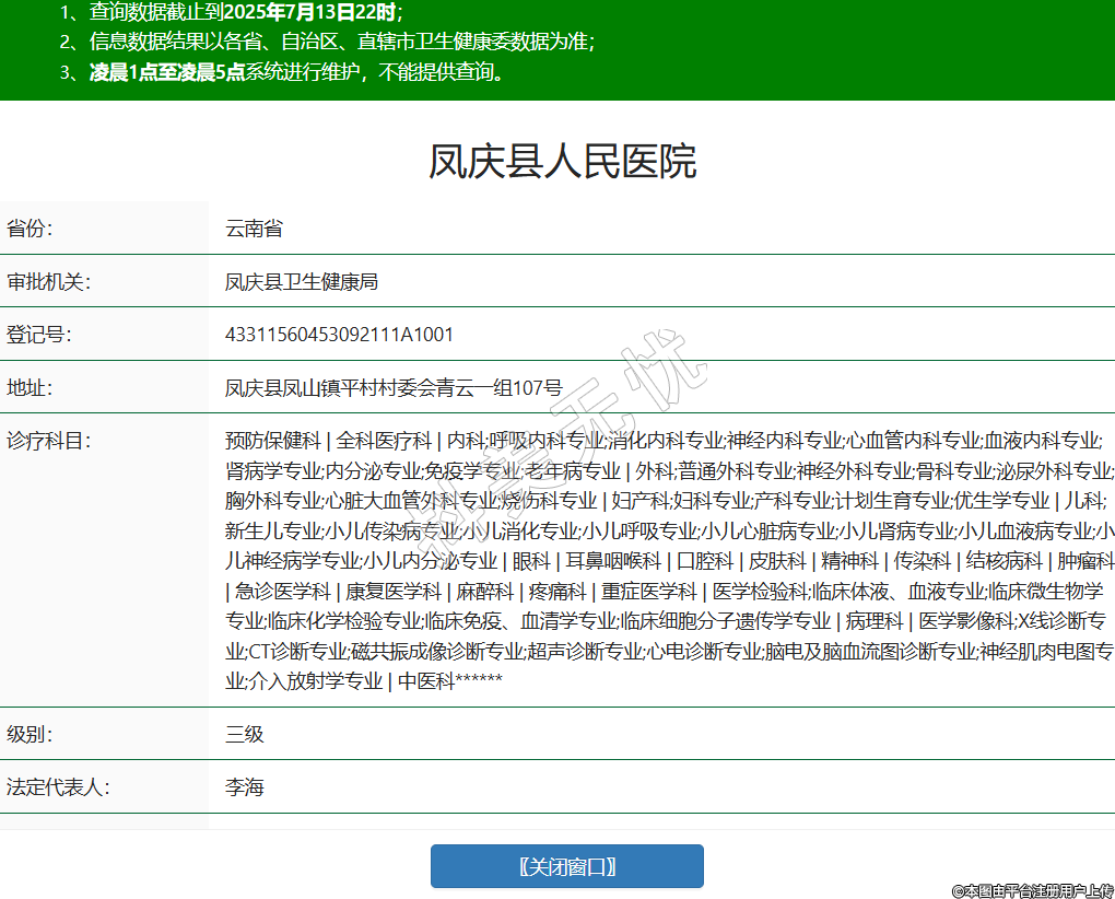 省份:云南省審批機(jī)關(guān):鳳慶縣衛(wèi)生健康局登記號:43311560453092111A1001地址:鳳慶縣鳳山鎮(zhèn)平村村委會青云一組107號診療科目:預(yù)防保健科 | 全科醫(yī)療科 | 內(nèi)科;呼吸內(nèi)科專業(yè);消化內(nèi)科專業(yè);神經(jīng)內(nèi)科專業(yè);心血管內(nèi)科專業(yè);血液內(nèi)科專業(yè);腎病學(xué)專業(yè);內(nèi)分泌專業(yè);免疫學(xué)專業(yè);老年病專業(yè) | 外科;普通外科專業(yè);神經(jīng)外科專業(yè);骨科專業(yè);泌尿外科專業(yè);胸外科專業(yè);心臟大血管外科專業(yè);燒傷科專業(yè) | 婦產(chǎn)科;婦科專業(yè);產(chǎn)科專業(yè);計劃生育專業(yè);優(yōu)生學(xué)專業(yè) | 兒科;新生兒專業(yè);小兒傳染病專業(yè);小兒消化專業(yè);小兒呼吸專業(yè);小兒心臟病專業(yè);小兒腎病專業(yè);小兒血液病專業(yè);小兒神經(jīng)病學(xué)專業(yè);小兒內(nèi)分泌專業(yè) | 眼科 | 耳鼻咽喉科 | 口腔科 | 皮膚科 | 精神科 | 傳染科 | 結(jié)核病科 | 腫瘤科 | 急診醫(yī)學(xué)科 | 康復(fù)醫(yī)學(xué)科 | 麻醉科 | 疼痛科 | 重癥醫(yī)學(xué)科 | 醫(yī)學(xué)檢驗科;臨床體液、血液專業(yè);臨床微生物學(xué)專業(yè);臨床化學(xué)檢驗專業(yè);臨床免疫、血清學(xué)專業(yè);臨床細(xì)胞分子遺傳學(xué)專業(yè) | 病理科 | 醫(yī)學(xué)影像科;X線診斷專業(yè);CT診斷專業(yè);磁共振成像診斷專業(yè);超聲診斷專業(yè);心電診斷專業(yè);腦電及腦血流圖診斷專業(yè);神經(jīng)肌肉電圖專業(yè);介入放射學(xué)專業(yè) | 中醫(yī)科******級別:三級法定代表人:李海主要負(fù)責(zé)人:李海執(zhí)業(yè)許可證有效期:2021/12/06 -至- 2036/12/05 -