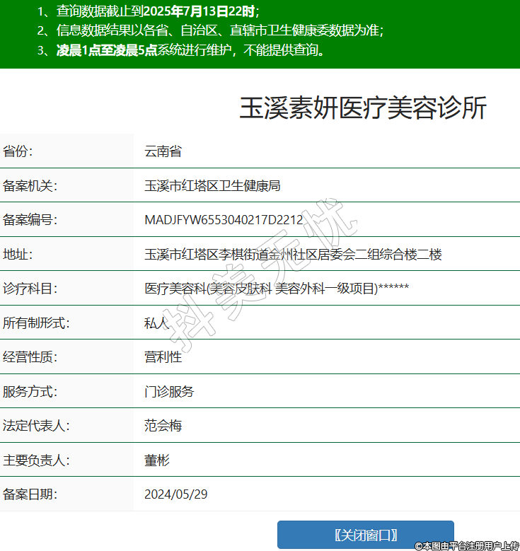 省份:云南省備案機(jī)關(guān):玉溪市紅塔區(qū)衛(wèi)生健康局備案編號(hào):MADJFYW6553040217D2212地址:玉溪市紅塔區(qū)李棋街道金州社區(qū)居委會(huì)二組綜合樓二樓診療科目:醫(yī)療美容科(美容皮膚科 美容外科一級(jí)項(xiàng)目)******所有制形式:私人經(jīng)營(yíng)性質(zhì):營(yíng)利性服務(wù)方式:門診服務(wù)法定代表人:范會(huì)梅主要負(fù)責(zé)人:董彬備案日期:2024/05/29 -