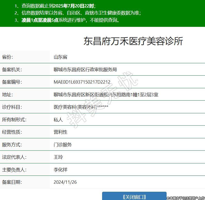 省份:山東省備案機(jī)關(guān):聊城市東昌府區(qū)行政審批服務(wù)局備案編號(hào):MAE0D1L6937150217D2212地址:聊城市東昌府區(qū)新區(qū)街道振興東路路南1幢1至2層3室診療科目:醫(yī)療美容科(美容外科)******所有制形式:私人經(jīng)營(yíng)性質(zhì):營(yíng)利性服務(wù)方式:門診服務(wù)法定代表人:王玲主要負(fù)責(zé)人:李化祥備案日期:2024/11/26 -